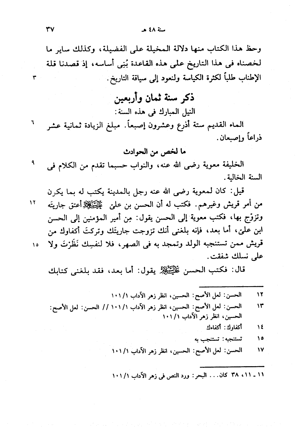 قيل: كان لمعوية رضى الله عنه رجل بالمدينة يكتب له بما يكون من أمر قريش وغيرهم. فكتب له أن الحسن بن علىّ عليه السّلام أعتق جاريته وتزوّج بها، فكتب معوية إلى الحسن يقول: من أمير المؤمنين إلى الحسن ابن علىّ، أما بعد، فإنه بلغنى أنك تزوجت جاريتك وتركت أكفاوك من قريش ممن تستنجبه الولد وتمجد به فى الصهر، فلا لنفسك نظرت ولا على نسلك شفقت.