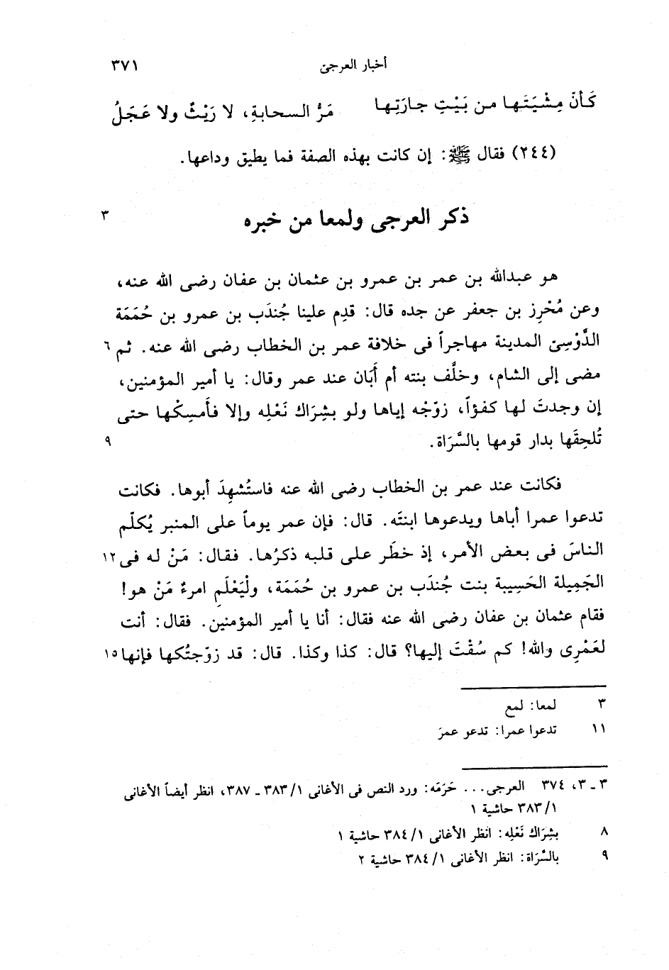 (3 - 3،374) العرجى. . . حرمه: ورد النص فى الأغانى 1/ 383 - 387، انظر أيضا الأغانى 1/ 383 حاشية 1