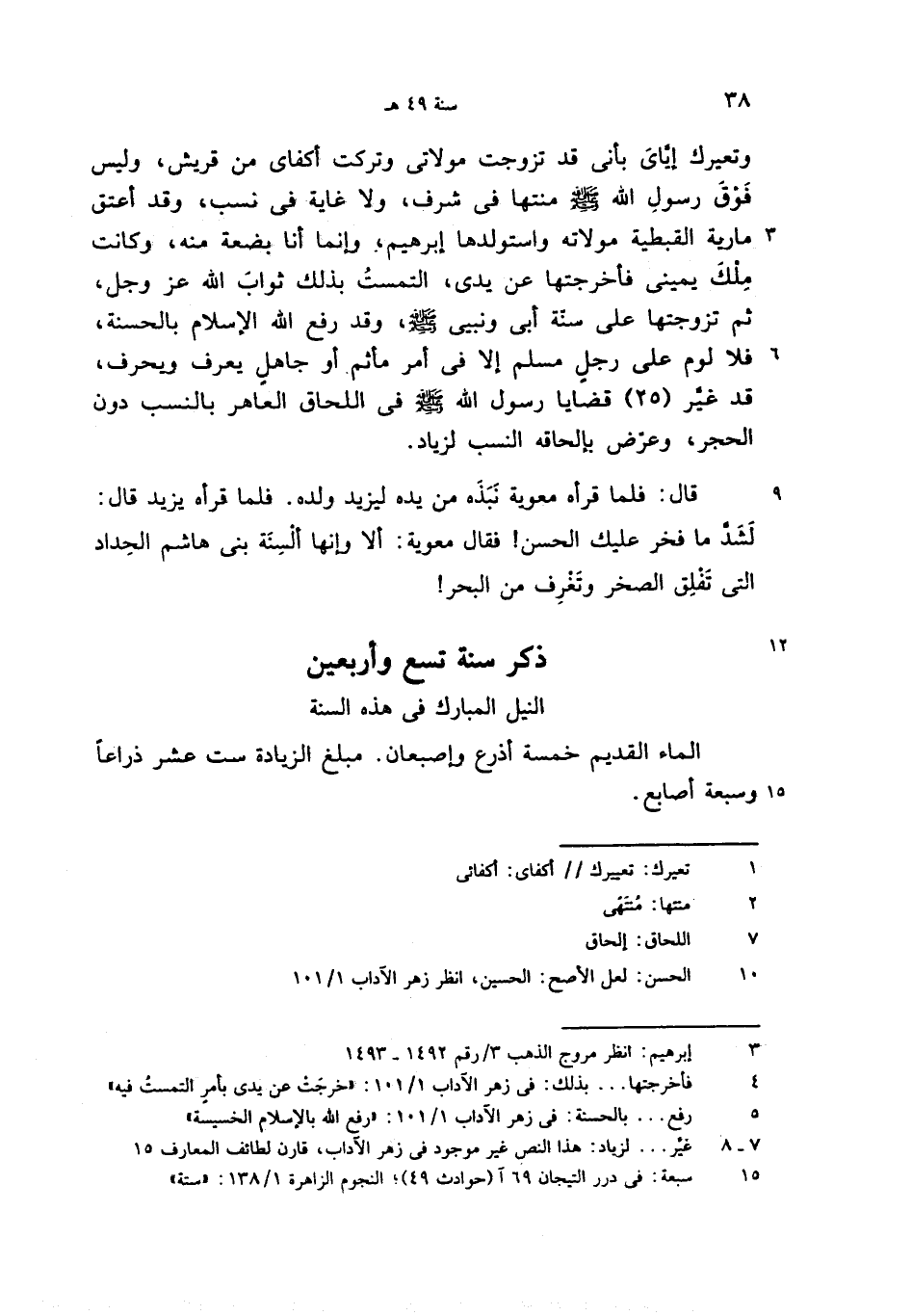 وتعيرك إيّاى بأنى قد تزوجت مولاتى وتركت أكفاى من قريش، وليس فوق رسول الله صلّى الله عليه وسلّم منتها فى شرف، ولا غاية فى نسب، وقد أعتق مارية القبطية مولاته واستولدها إبراهيم، وإنما أنا بضعة منه، وكانت ملك يمينى فأخرجتها عن يدى، التمست بذلك ثواب الله عز وجل، ثم تزوجتها على سنّة أبى ونبيى صلّى الله عليه وسلّم، وقد رفع الله الإسلام بالحسنة، فلا لوم على رجل مسلم إلا فى أمر مأثم أو جاهل يعرف ويحرف، قد غيّر (25) قضايا رسول الله صلّى الله عليه وسلّم فى اللحاق العاهر بالنسب دون الحجر، وعرّض بإلحاقه النسب لزياد.
