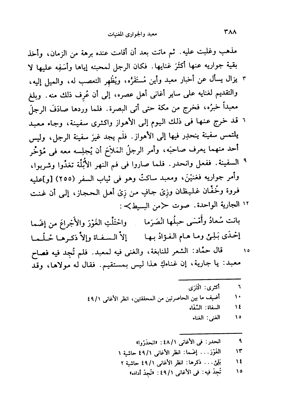 مذهب وغلبت عليه. ثم ماتت بعد أن أقامت عنده برهة من الزمان، وأخذ بقية جواريه عنها أكثر غنايها. فكان الرجل لمحبته إياها وأسفه عليها لا يزال يسأل عن أخبار معبد وأين مستقرّه، ويظهر التعصب له، والميل إليه، والتقديم لغنايه على ساير أغانى أهل عصره، إلى أن عرف ذلك منه. وبلغ معبدا خبره، فخرج من مكة حتى أتى البصرة. فلما وردها صادف الرجل قد خرج عنها فى ذلك اليوم إلى الأهواز واكثرى سفينة، وجاء معبد يلتمس سفينة ينحدر فيها إلى الأهواز. فلم يجد غير سفينة الرجل، وليس أحد منهما يعرف صاحبه، وأمر الرجل الملاّح أن يجلسه معه فى مؤخّر السفينة. ففعل وانحدر. فلما صاروا فى فم النهر الأبلّة تغدّوا وشربوا، وأمر جواريه فغنين، ومعبد ساكت وهو فى ثياب السفر (255) [و] عليه فروة وخفّان غليظان وزىّ جاف من زىّ أهل الحجاز، إلى أن غنت الجارية الواحدة. صوت <من البسيط>: