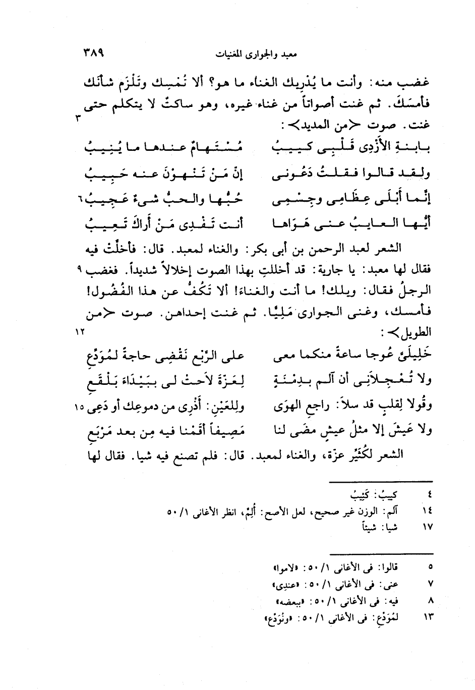 الشعر لعبد الرحمن بن أبى بكر: والغناء لمعبد. قال: فأخلّت فيه فقال لها معبد: يا جارية: قد أخللت بهذا الصوت إخلالا شديدا. فغضب الرجل فقال: ويلك! ما أنت والغناء! ألا تكفّ عن هذا الفضول! فأمسك، وغنى الجوارى مليّا. ثم غنت إحداهن. صوت <من الطويل>: