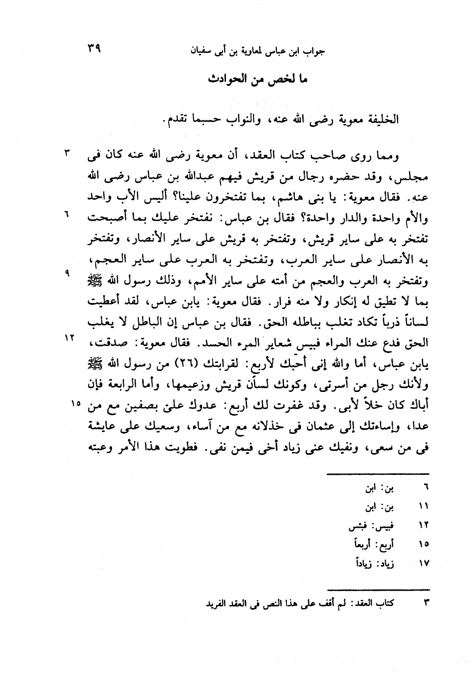 ومما روى صاحب كتاب العقد، أن معوية رضى الله عنه كان فى مجلس، وقد حضره رجال من قريش فيهم عبد الله بن عباس رضى الله عنه. فقال معوية: يا بنى هاشم، بما تفتخرون علينا؟ أليس الأب واحد والأم واحدة والدار واحدة؟ فقال بن عباس: نفتخر عليك بما أصبحت تفتخر به على ساير قريش، وتفتخر به قريش على ساير الأنصار، وتفتخر به الأنصار على ساير العرب، وتفتخر به العرب على ساير العجم، وتفتخر به العرب والعجم من أمته على ساير الأمم، وذلك رسول الله صلّى الله عليه وسلم بما لا تطيق له إنكار ولا منه فرار. فقال معوية: يا بن عباس، لقد أعطيت لسانا ذربا تكاد تغلب بباطله الحق. فقال بن عباس إن الباطل لا يغلب الحق فدع عنك المراء فبيس شعاير المرء الحسد. فقال معوية: صدقت، يابن عباس، أما والله إنى أحبك لأربع: لقرابتك (26) من رسول الله صلّى الله عليه وسلم ولأنك رجل من أسرتى، وكونك لسان قريش وزعيمها، وأما الرابعة فإن أباك كان خلا لأبى. وقد غفرت لك أربع: عدوك علىّ بصفين مع من عدا، وإساءتك إلى عثمان فى خذلانه مع من آساء، وسعيك على عايشة فى من سعى، ونفيك عنى زياد أخى فيمن نفى. فطويت هذا الأمر وعبته