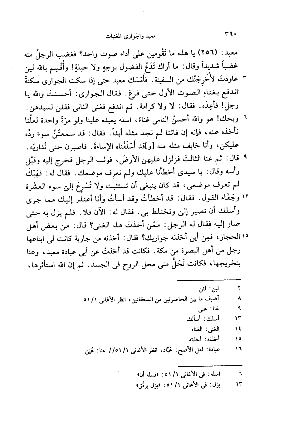 معبد: (256) يا هذه ما تقومين على أداء صوت واحد؟ فغضب الرجل منه غضبا شديدا وقال: ما أراك تدع الفضول بوجه ولا حيلة! وأقسم بالله لين عاودت لأخرجنّك من السفينة. فأمسك معبد حتى إذا سكت الجوارى سكتة اندفع بغناء الصوت الأول حتى فرغ. فقال الجوارى: أحسنت والله يا رجل! فأعده. فقال: لا ولا كرامة. ثم اندفع فغنى الثانى فقلن لسيدهن: