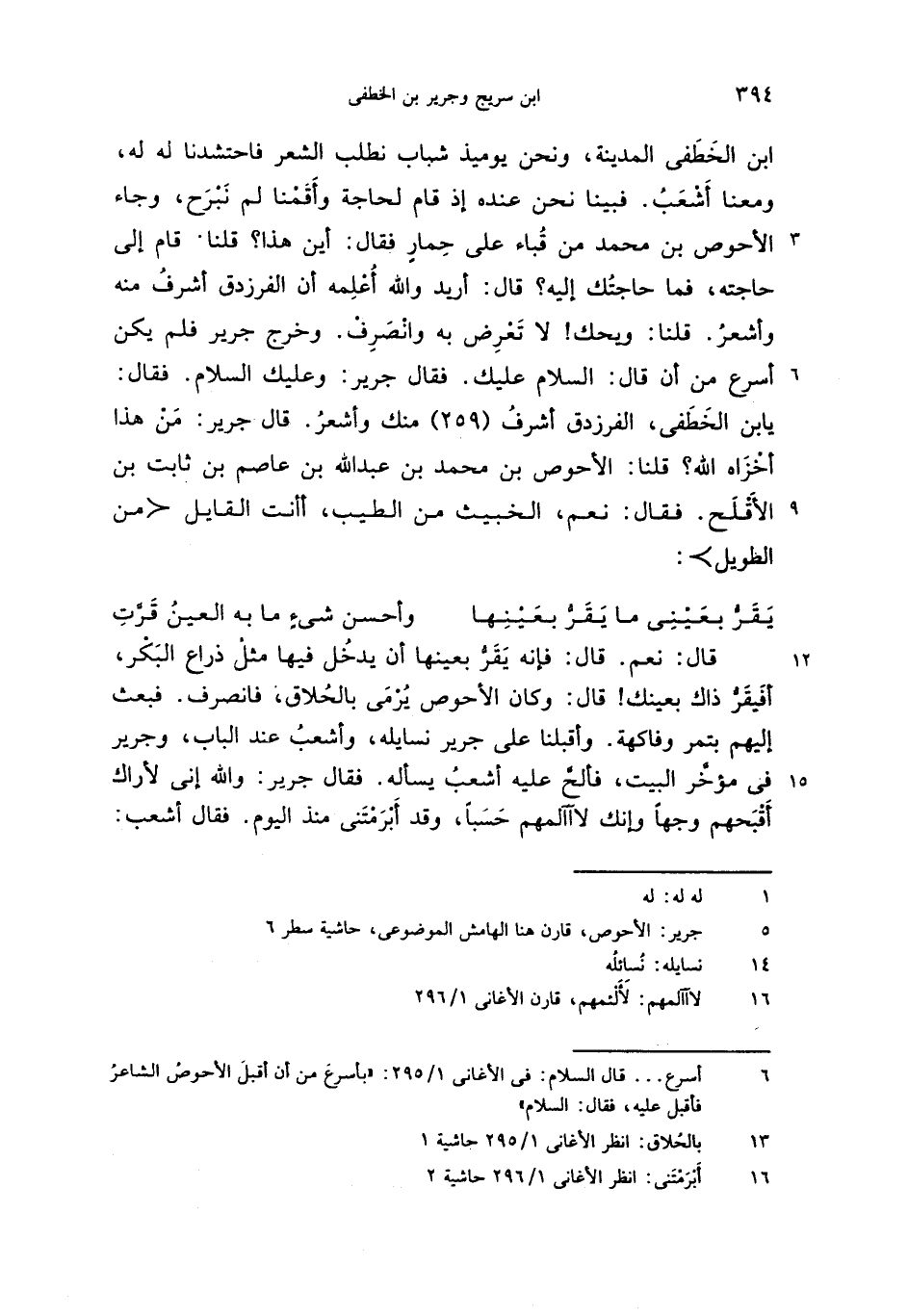 يابن الخطفى، الفرزدق أشرف (259) منك وأشعر. قال جرير: من هذا أخزاه الله؟ قلنا: الأحوص بن محمد بن عبد الله بن عاصم بن ثابت بن الأقلح. فقال: نعم، الخبيث من الطيب، أأنت القايل <من الطويل>: