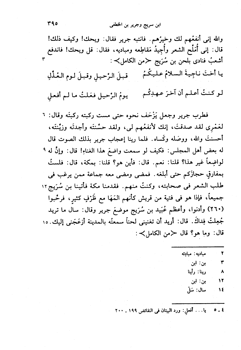 لعمرى لقد صدقت، إنك لأنفعهم لى، ولقد حسّنته وأجدته وزيّنته، أحسنت والله، ووصله وكساه. فلما رينا إعجاب جرير بذلك الصوت قال له بعض أهل المجلس: فكيف لو سمعت واضع هذا الغناء! قال: وإنّ له لواضعا غير هذا؟ قلنا: نعم. قال: فأين هو؟ قلنا: بمكة، قال: فلست بمفارق حجازكم حتى أبلغه. فمضى ومضى معه جماعة ممن يرغب فى طلب الشعر فى صحابته، وكنت منهم. فقدمنا مكة فأتينا بن سريج جميعا، فإذا هو فى فتية من قريش كأنهم المها مع ظرف كثير، فرحّبوا (260) وأدنوا، وأعظم عبيد بن سريج موضع جرير وقال: سال ما تريد جعلت فداك. قال: أريد أن تغنينى لحنا سمعته بالمدينة أزعجنى إليك.