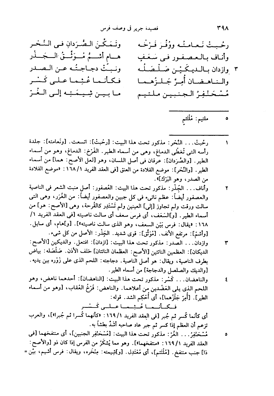 (1) رحبت. . . النّحر: مذكور تحت هذا البيت: [رحبت]: اتسعت. [ونعامته]: جلدة رأسه التى تغطّى الدماغ، وهى من أسماء الطير. الفرخ: الدماغ، وهو من أسماء الطير. [والصّردان]: عرقان فى أصل اللسان، وهو [لعل الأصح: هما] من أسماء الطير. [والنّحر]: موضع القلادة من العنق [فى العقد الفريد 1/ 168: «موضع القلادة من الصدر، وهو البرك]».