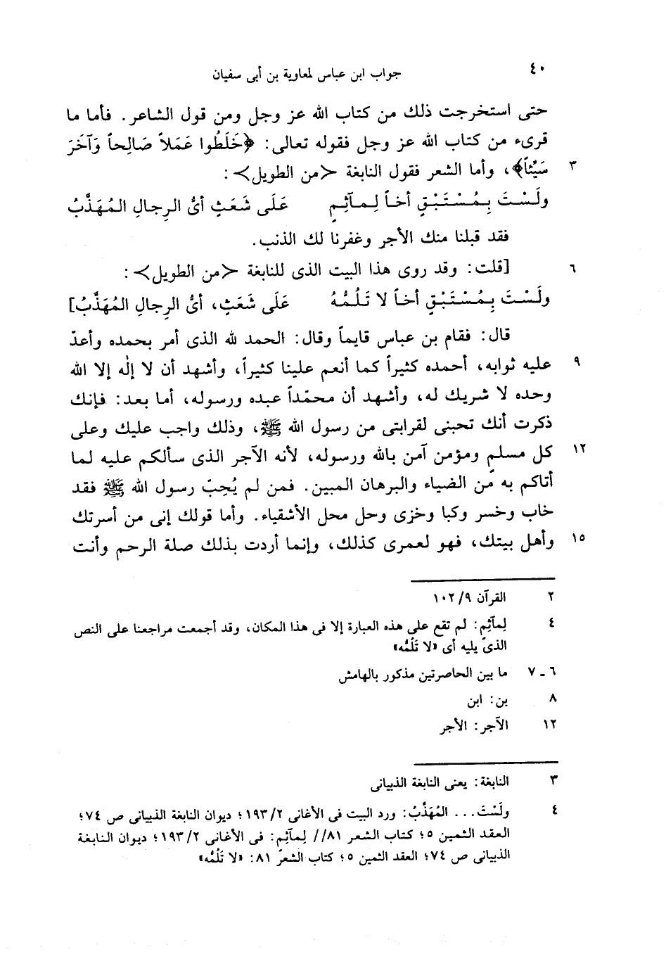 (4) ولست. . . المهذّب: ورد البيت فى الأغانى 2/ 193؛ ديوان النابغة الذبيانى ص 74؛ العقد الثمين 5؛ كتاب الشعر /81/لمآثم: فى الأغانى 2/ 193؛ ديوان النابغة الذبيانى ص 74؛ العقد الثمين 5؛ كتاب الشعر 81: «لا تلمّه»
