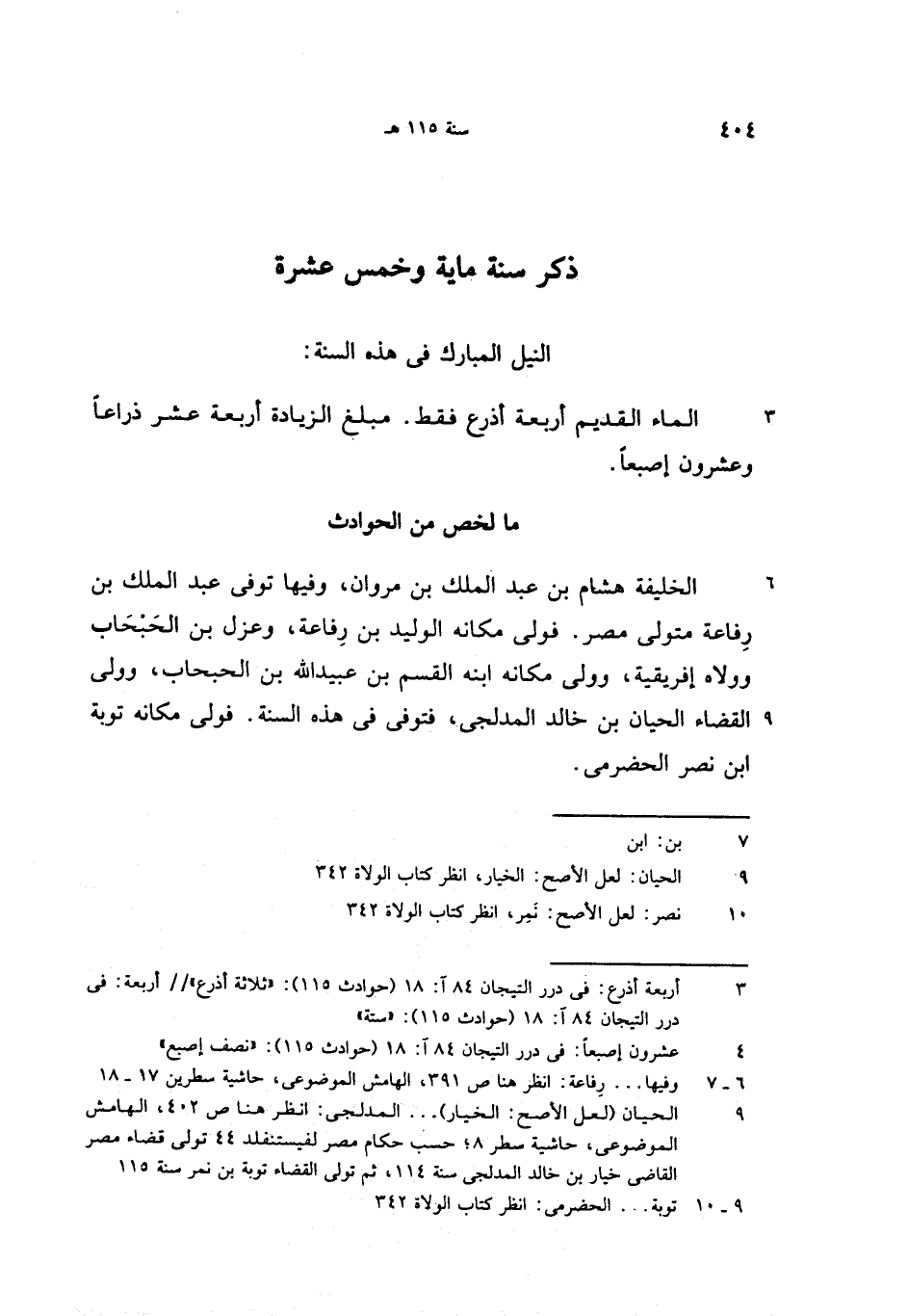(9) الحيان (لعل الأصح: الخيار). . . المدلجى: انظر هنا ص 402، الهامش الموضوعى، حاشية سطر 8؛ حسب حكام مصر لفيستنفلد 44 تولى قضاء مصر القاضى خيار بن خالد المدلجى سنة 114، ثم تولى القضاء توبة بن نمر سنة 115
