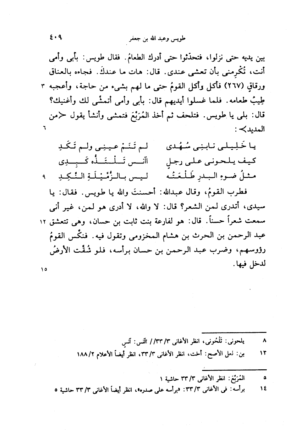 بين يديه حتى نزلوا، فتحدّثوا حتى أدرك الطعام. فقال طويس: بأبى وأمى أنت، تكرمنى بأن تعشى عندى. قال: هات ما عندك. فجاءه بالعناق ورقاق (267) فأكل وأكل القوم حتى ما لهم بشئ من حاجة، وأعجبه طيب طعامه. فلما غسلوا أيديهم قال: بأبى وأمى أتمشّى لك وأغنيك؟ قال: بلى يا طويس. فتلحف ثم أخذ المربّع فتمشى وأنشأ يقول <من المديد>: