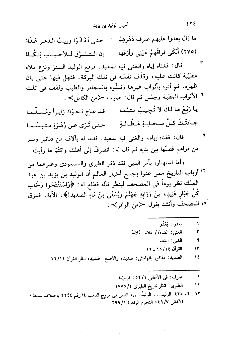 (12 - 2،425) الوليد. . . الوليد: ورد النص فى مروج الذهب 4/رقم 2244 باختلاف بسيط؛ الأغانى 7/ 49؛ النجوم الزاهرة 1/ 299