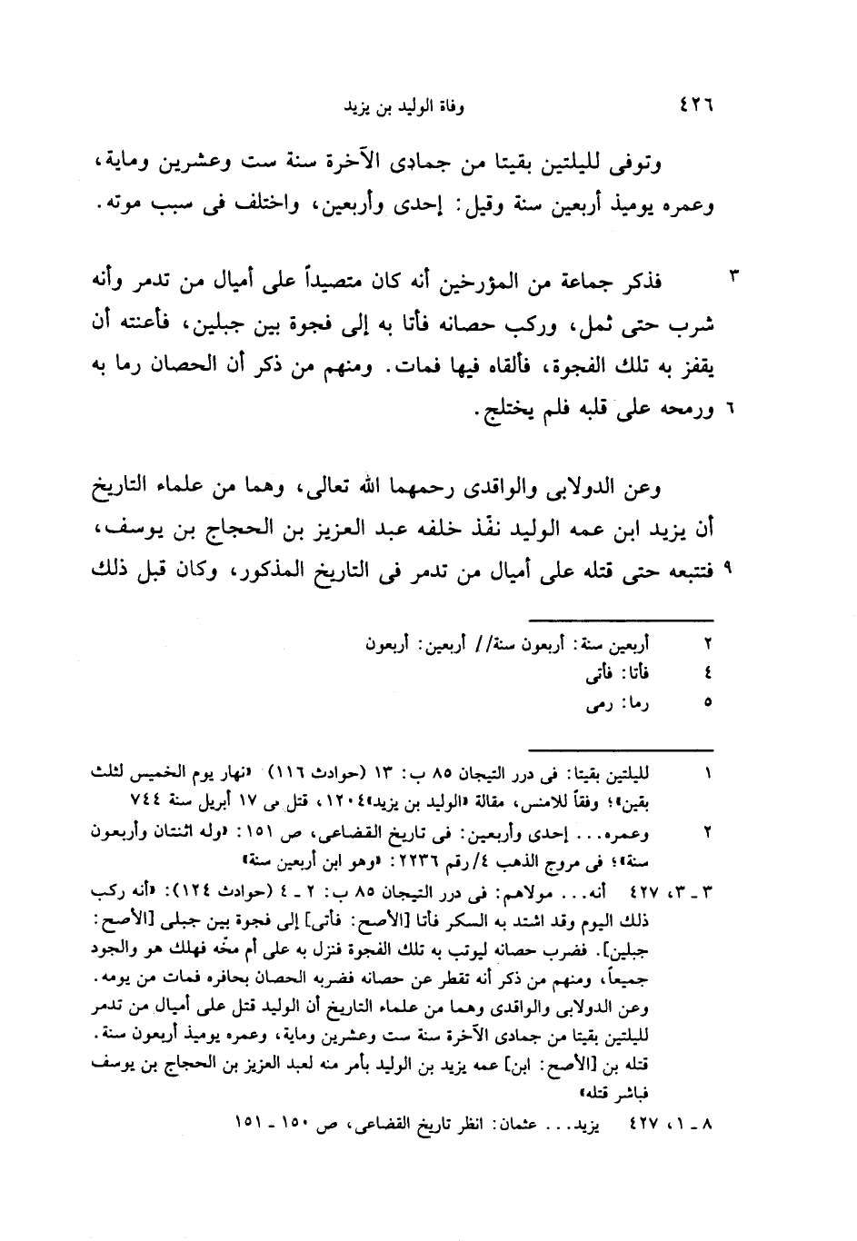 (1) لليلتين بقيتا: فى درر التيجان 85 ب:13 (حوادث 116) «نهار يوم الخميس لثلث بقين»؛ وفقا للامنس، مقالة «الوليد بن يزيد» 1204، قتل فى 17 أبريل سنة 744