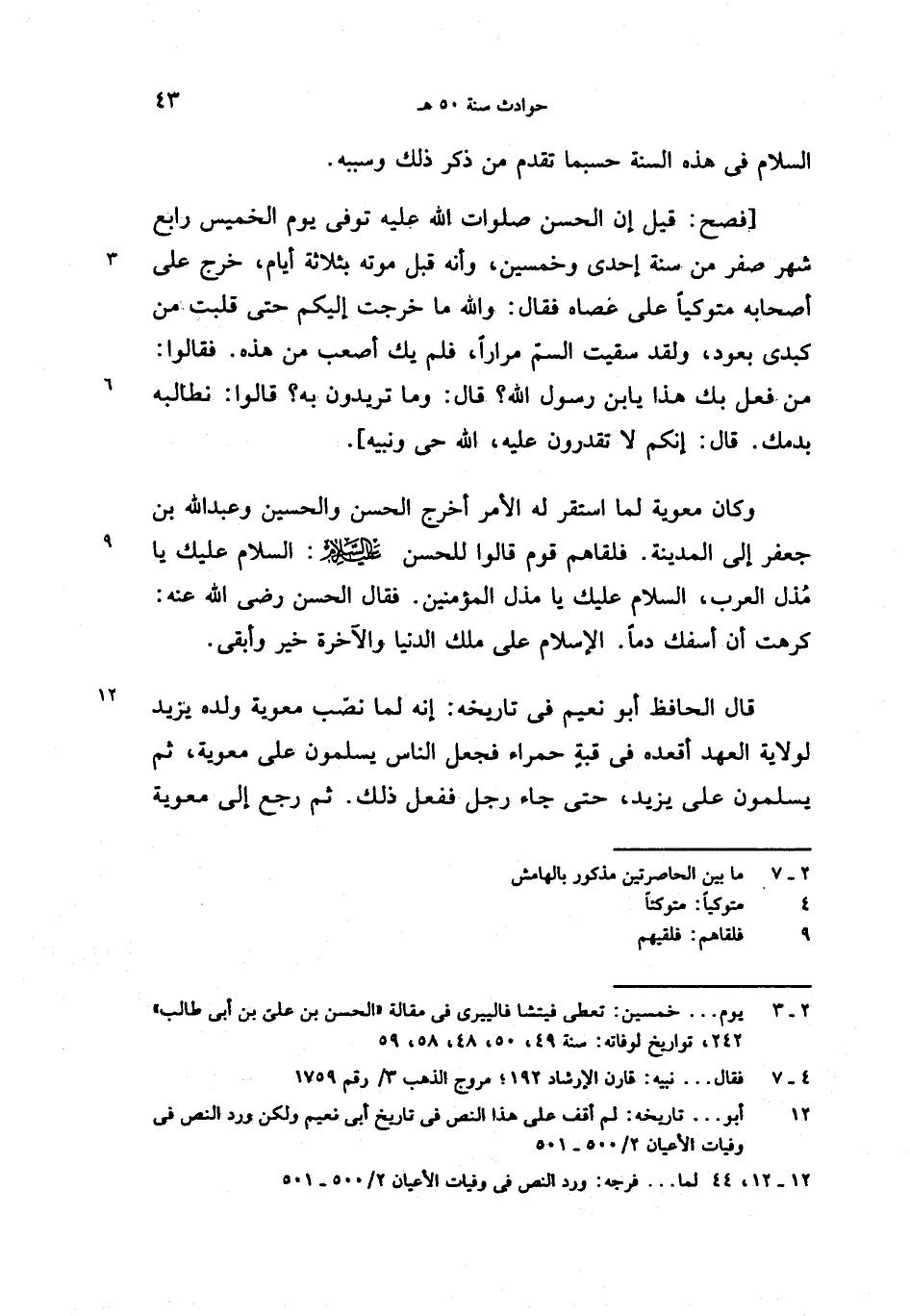 (2 - 3) يوم. . . خمسين: تعطى فيتشا فالييرى فى مقالة «الحسن بن علىّ بن أبى طالب» 242، تواريخ لوفاته: سنة 49،50،48،58،59