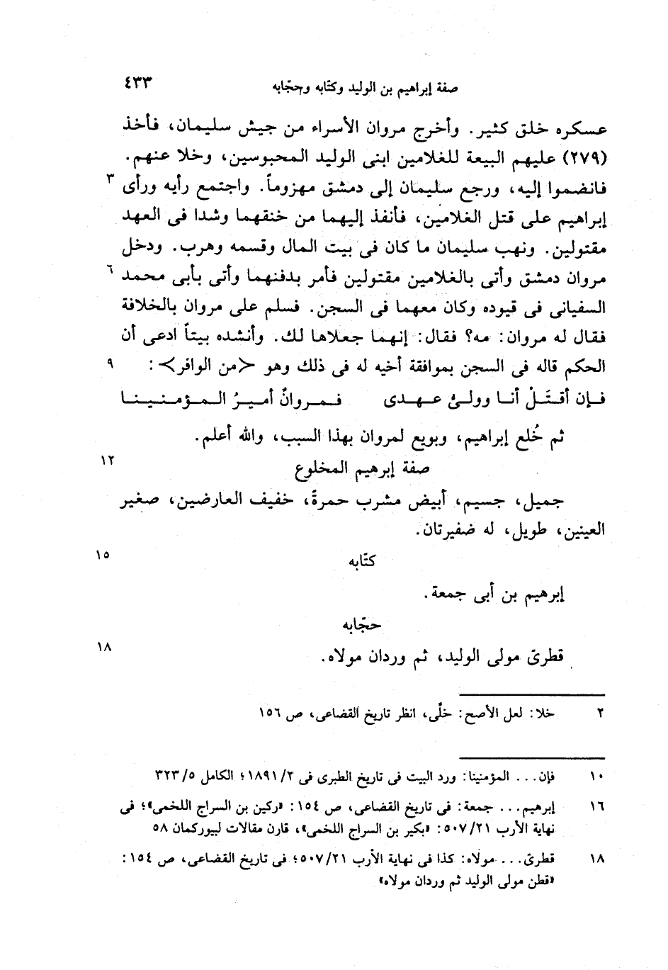 فانضموا إليه، ورجع سليمان إلى دمشق مهزوما. واجتمع رأيه ورأى إبراهيم على قتل الغلامين، فأنفذ إليهما من خنقهما وشدا فى العهد مقتولين. ونهب سليمان ما كان فى بيت المال وقسمه وهرب. ودخل مروان دمشق وأتى بالغلامين مقتولين فأمر بدفنهما وأتى بأبى محمد السفيانى فى قيوده وكان معهما فى السجن. فسلم على مروان بالخلافة فقال له مروان: مه؟ فقال: إنهما جعلاها لك. وأنشده بيتا ادعى أن الحكم قاله فى السجن بموافقة أخيه له فى ذلك وهو <من الوافر>: