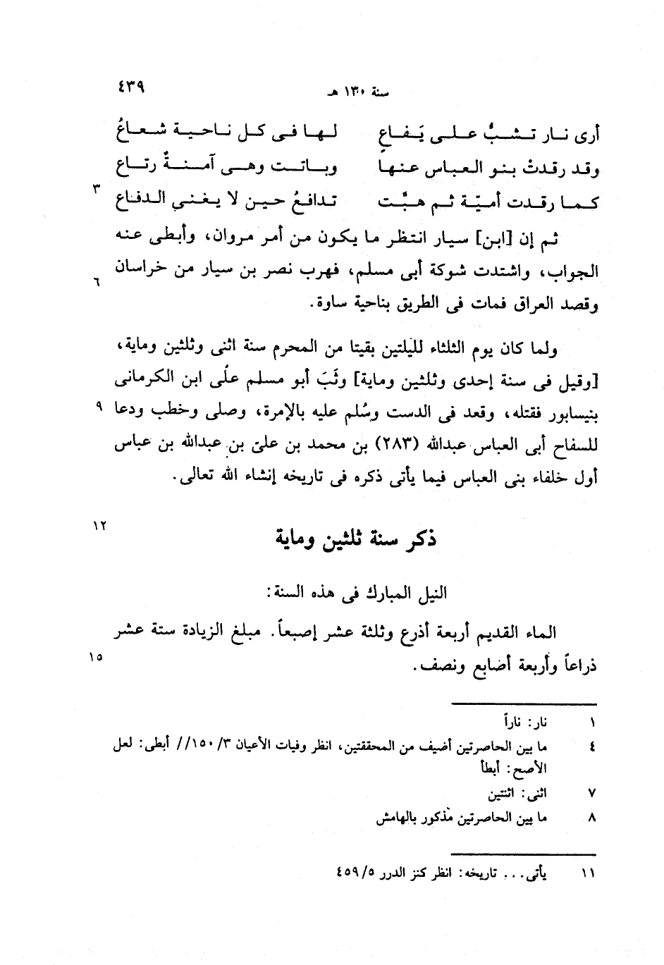 ولما كان يوم الثلثاء لليلتين بقيتا من المحرم سنة اثنى وثلثين وماية، [وقيل فى سنة إحدى وثلثين وماية] وثب أبو مسلم على ابن الكرمانى بنيسابور فقتله، وقعد فى الدست وسلّم عليه بالإمرة، وصلى وخطب ودعا للسفاح أبى العباس عبد الله (283) بن محمد بن علىّ بن عبد الله بن عباس أول خلفاء بنى العباس فيما يأتى ذكره فى تاريخه إنشاء الله تعالى.