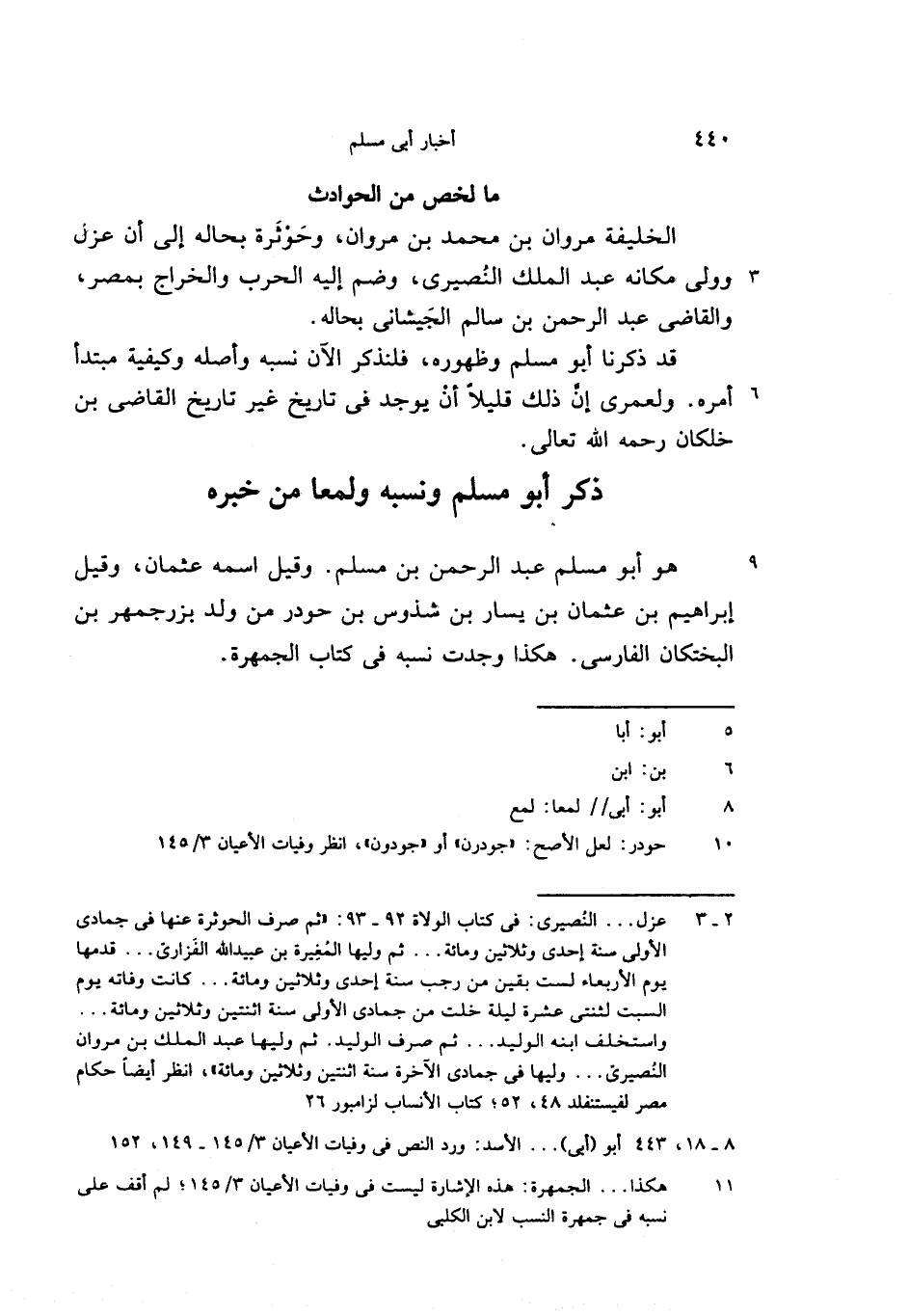 قد ذكرنا أبو مسلم وظهوره، فلنذكر الآن نسبه وأصله وكيفية مبتدأ أمره. ولعمرى إنّ ذلك قليلا أن يوجد فى تاريخ غير تاريخ القاضى بن خلكان رحمه الله تعالى.