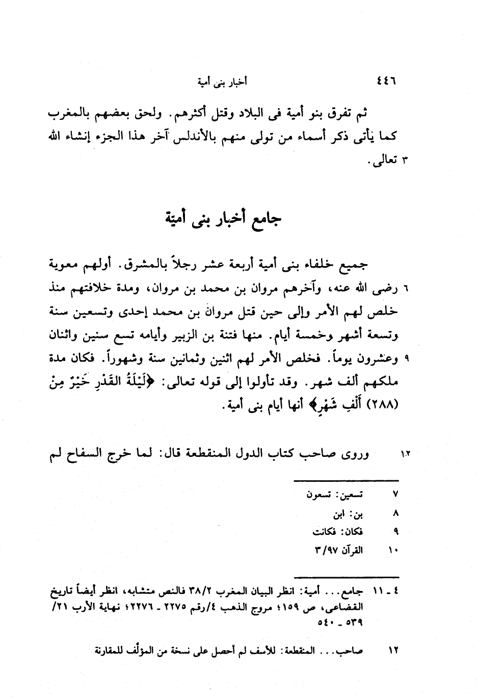 (4 - 11) جامع. . . أمية: انظر البيان المغرب 2/ 38 فالنص متشابه، انظر أيضا تاريخ القضاعى، ص 159؛ مروج الذهب 4/رقم 2275 - 2276؛ نهاية الأرب 21/ 539 - 540