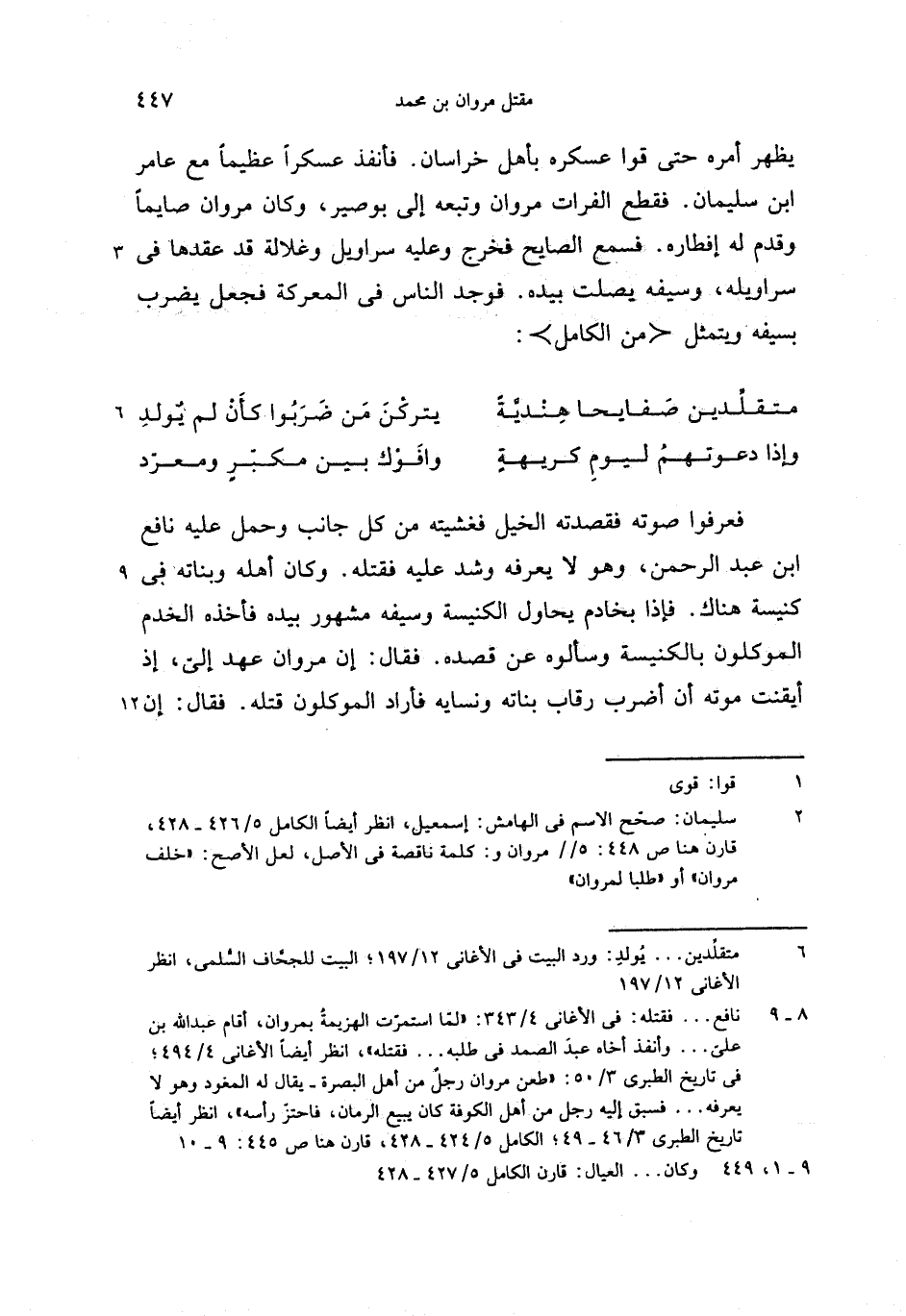 (8 - 9) نافع. . . فقتله: فى الأغانى 4/ 343: «لمّا استمرّت الهزيمة بمروان، أقام عبد الله بن علىّ. . . وأنفذ أخاه عبد الصمد فى طلبه. . . فقتله»، انظر أيضا الأغانى 4/ 494؛ فى تاريخ الطبرى 3/ 50: «طعن مروان رجل من أهل البصرة-يقال له المغود وهو لا يعرفه. . . فسبق إليه رجل من أهل الكوفة كان يبيع الرمان، فاحتزّ رأسه»، انظر أيضا تاريخ الطبرى 3/ 46 - 49؛ الكامل 5/ 424 - 428، قارن هنا ص 445:9 - 10