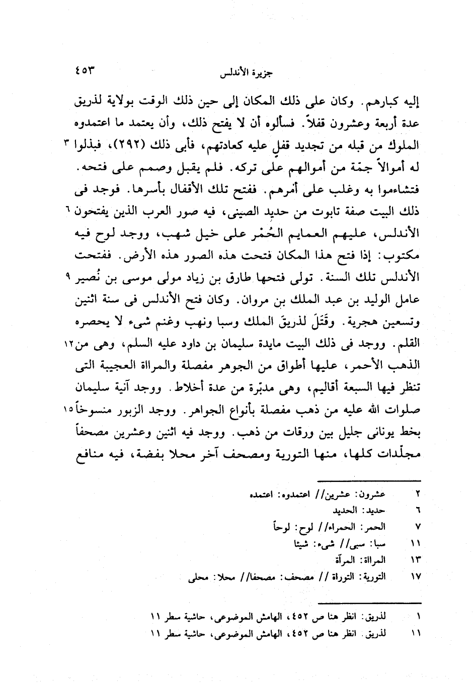 فتشاءموا به وغلب على أمرهم. ففتح تلك الأقفال بأسرها. فوجد فى ذلك البيت صفة تابوت من حديد الصينى، فيه صور العرب الذين يفتحون الأندلس، عليهم العمايم الحمر على خيل شهب، ووجد لوح فيه مكتوب: إذا فتح هذا المكان فتحت هذه الصور هذه الأرض. ففتحت الأندلس تلك السنة. تولى فتحها طارق بن زياد مولى موسى بن نصير عامل الوليد بن عبد الملك بن مروان. وكان فتح الأندلس فى سنة اثنين وتسعين هجرية. وقتل لذريق الملك وسبا ونهب وغنم شئ لا يحصره القلم. ووجد فى ذلك البيت مايدة سليمان بن داود عليه السلم، وهى من الذهب الأحمر، عليها أطواق من الجوهر مفصلة والمرااة العجيبة التى تنظر فيها السبعة أقاليم، وهى مدبّرة من عدة أخلاط. ووجد آنية سليمان صلوات الله عليه من ذهب مفصلة بأنواع الجواهر. ووجد الزبور منسوخا بخط يونانى جليل بين ورقات من ذهب. ووجد فيه اثنين وعشرين مصحفا مجلّدات كلها، منها التورية ومصحف آخر محلا بفضة، فيه منافع