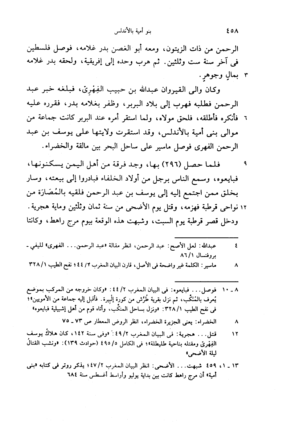 (13 - 1،459) شبهت. . . الأضحى: انظر البيان المغرب 2/ 47؛ يذكر روتر فى كتابه «بنى أمية» أن مرج راهط كانت بين بداية يوليو وأواسط أغسطس سنة 684
