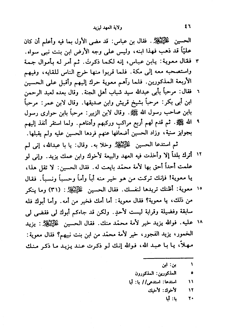 ثم استدعا الحسين عليه السّلام وخلا به. وقال: يا با عبد الله، إنى لم أترك بلدا إلا وأخذت فيه العهد والبيعة لأخوك وابن عمك يزيد. وإنى لو علمت أحدا أحق بها لأمة محمّد بايعت له. فقال الحسين: لا تقل هذا، يا معوية! فإنك تركت من هو خير منه أبا وأما وحسبا ونسبا. فقال معوية: أظنك تريدها لنفسك. فقال الحسين عليه السّلام: (31) وما ينكر من ذلك، يا معوية؟ فقال معوية: أما أمك فخير من أمه. وأما أبوك فله سابقة وفضيلة وقرابة ليست لأحد. ولكن قد جاءكم أبوك لى فقضى لى عليه. فو الله يزيد خير لأمة محمّد منك. فقال الحسين عليه السّلام: يزيد الخمور، يزيد الفجور، خير لأمة محمّد من ابن بنت نبيهم؟ فقال معوية:
