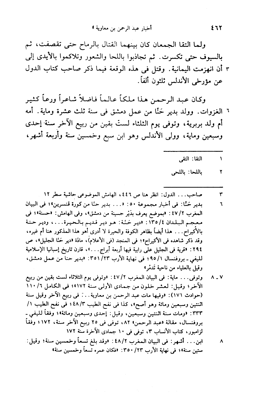(7 - 8) وتوفى. . . ماية: فى البيان المغرب 2/ 47: «وتوفى يوم الثلاثاء لست بقين من ربيع الآخر؛ وقيل: لعشر خلون من جمادى الأولى سنة 172»؛ فى الكامل 6/ 110 (حوادث 171): «وفيها مات عبد الرحمن بن معاوية. . . فى ربيع الآخر وقيل سنة اثنتين وسبعين ومائة وهو أصح»، كذا فى نفح الطيب 3/ 48؛ فى نفح الطيب 1/ 333: «ومات سنة اثنتين وسبعين، وقيل: إحدى وسبعين ومائة»؛ وفقا لليفي- بروفنسال، مقالة «عبد الرحمن» 82، توفى فى 25 ربيع الآخر سنة،172؛ وفقا لزامبور، كتاب الأنساب 3، توفى فى 10 جمادى الآخرة سنة 172