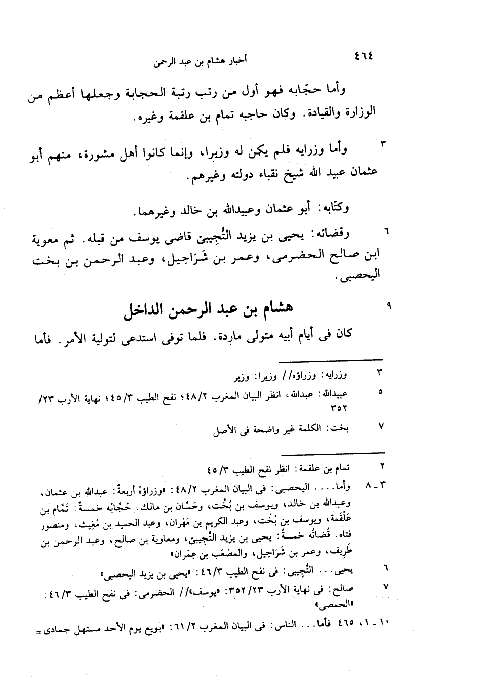 (3 - 8) وأما. . . . اليحصبى: فى البيان المغرب 2/ 48: «وزراؤه أربعة: عبد الله بن عثمان، وعبد الله بن خالد، ويوسف بن بخت، وحسّان بن مالك. حجّابه خمسة: تمّام بن علقمة، ويوسف بن بخت، وعبد الكريم بن مهران، وعبد الحميد بن مغيث، ومنصور فتاه. قضاته خمسة: يحيى بن يزيد التّجيبىّ، ومعاوية بن صالح، وعبد الرحمن بن طريف، وعمر بن شراحيل، والمصعب بن عمران»