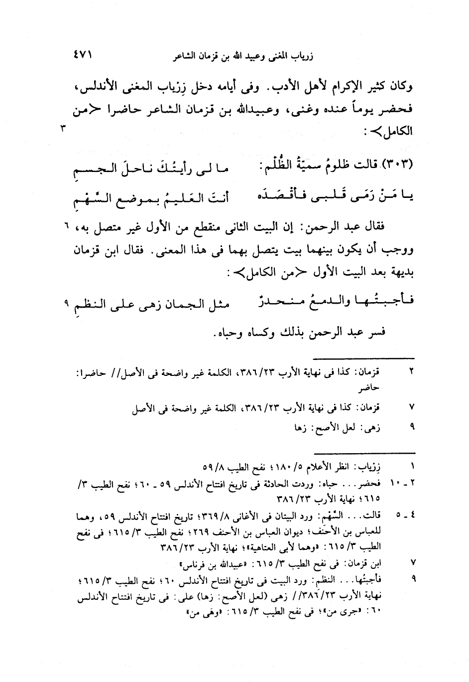 (9) فأجبتها. . . النظم: ورد البيت فى تاريخ افتتاح الأندلس 60؛ نفح الطيب 3/ 615؛ نهاية الأرب /23/ 386/زهى (لعل الأصح: زها) على: فى تاريخ افتتاح الأندلس 60: «جرى من»؛ فى نفح الطيب 3/ 615: «وهى من»