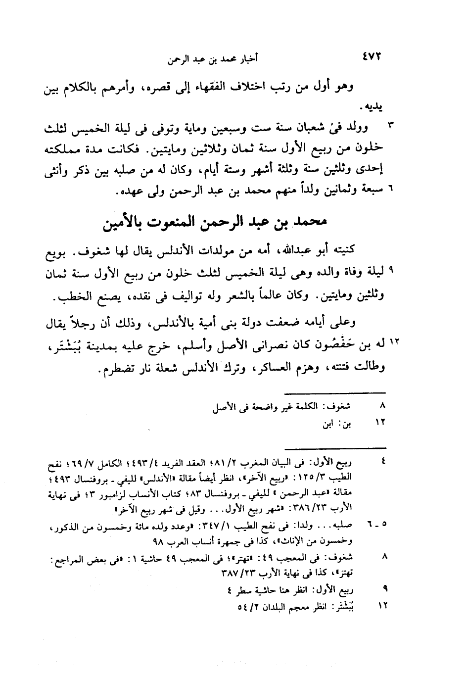 (4) ربيع الأول: فى البيان المغرب 2/ 81؛ العقد الفريد 4/ 493؛ الكامل 7/ 69؛ نفح الطيب 3/ 125: «ربيع الآخر»، انظر أيضا مقالة «الأندلس» لليفي-بروفنسال 493؛ مقالة «عبد الرحمن» لليفي-بروفنسال 83؛ كتاب الأنساب لزامبور 3؛ فى نهاية الأرب 23/ 386: «شهر ربيع الأول. . . وقيل فى شهر ربيع الآخر»