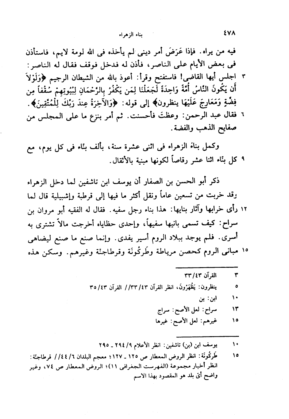 ذكر أبو الحسن بن الصفار أن يوسف ابن تاشفين لما دخل الزهراء وقد خربت من تسعين عاما ونقل أكثر ما فيها إلى قرطبة وإشبيلية قال لما رأى خرابها وآثار بنايها: هذا بناء رجل سفيه. فقال له الفقيه أبو مروان بن سراح: كيف تسمى بانيها سفيها، وإحدى حظاياه أخرجت مالا تشترى به أسرى. فلم يوجد ببلاد الروم أسير يفدى. وإنما صنع ما صنع ليضاهى مبانى الروم كحصن مرياطة وطركونة وقرطاجنّة وغيرهم. وسكن هذه