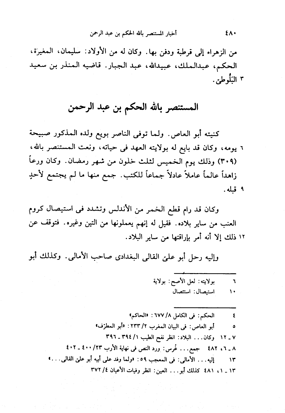 كنيته أبو العاص. ولما توفى الناصر بويع ولده المذكور صبيحة يومه، وكان قد بايع له بولايته العهد فى حياته، ونعت المستنصر بالله، (309) وذلك يوم الخميس لثلث خلون من شهر رمضان. وكان ورعا زاهدا عالما عاملا عادلا جماعا للكتب. جمع منها ما لم يجتمع لأحد قبله.