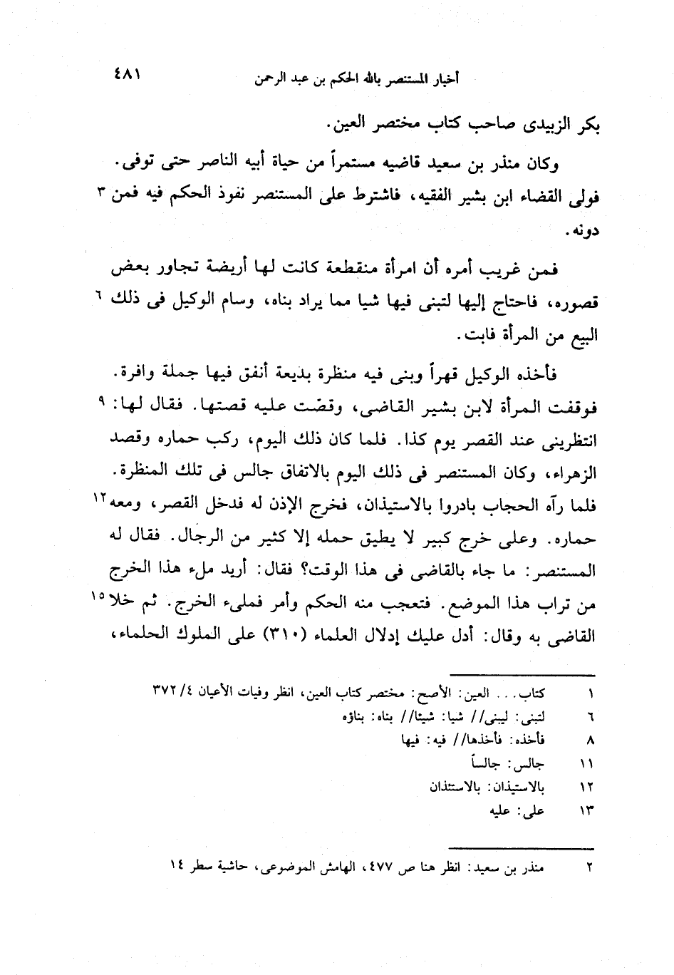 فلما رآه الحجاب بادروا بالاستيذان، فخرج الإذن له فدخل القصر، ومعه حماره. وعلى خرج كبير لا يطيق حمله إلا كثير من الرجال. فقال له المستنصر: ما جاء بالقاضى فى هذا الوقت؟ فقال: أريد ملء هذا الخرج من تراب هذا الموضع. فتعجب منه الحكم وأمر فملئ الخرج. ثم خلا القاضى به وقال: أدل عليك إدلال العلماء (310) على الملوك الحلماء،