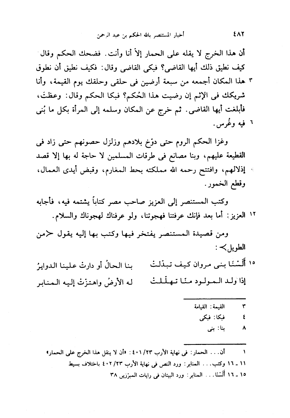 كيف نطيق ذلك أيها القاضى؟ فبكى القاضى وقال: فكيف نطيق أن نطوق هذا المكان أجمعه من سبعة أرضين فى حلقى وحلقك يوم القيمة، وأنا شريكك فى الإثم إن رضيت هذا الحكم؟ فبكا الحكم وقال: وعظت، فأبلغت أيها القاضى. ثم خرج عن المكان وسلمه إلى المرأة بكل ما بنى فيه وغرس.
