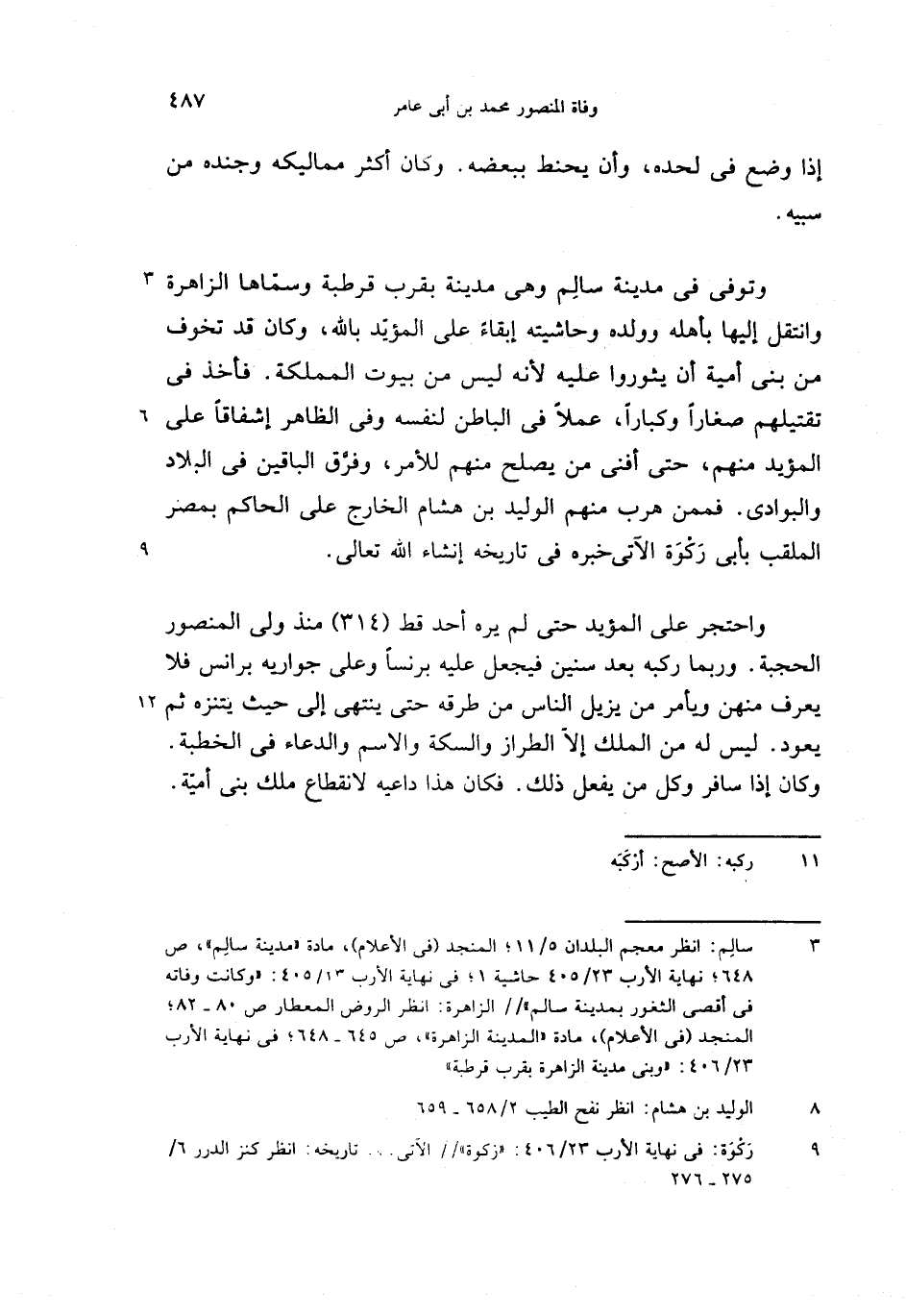 (3) سالم: انظر معجم البلدان 5/ 11؛ المنجد (فى الأعلام)، مادة «مدينة سالم»، ص 648؛ نهاية الأرب 23/ 405 حاشية 1؛ فى نهاية الأرب 13/ 405: «وكانت وفاته فى أقصى الثغور بمدينة سالم» //الزاهرة: انظر الروض المعطار ص 80 - 82؛ المنجد (فى الأعلام)، مادة «المدينة الزاهرة»، ص 645 - 648؛ فى نهاية الأرب 23/ 406: «وبنى مدينة الزاهرة بقرب قرطبة»