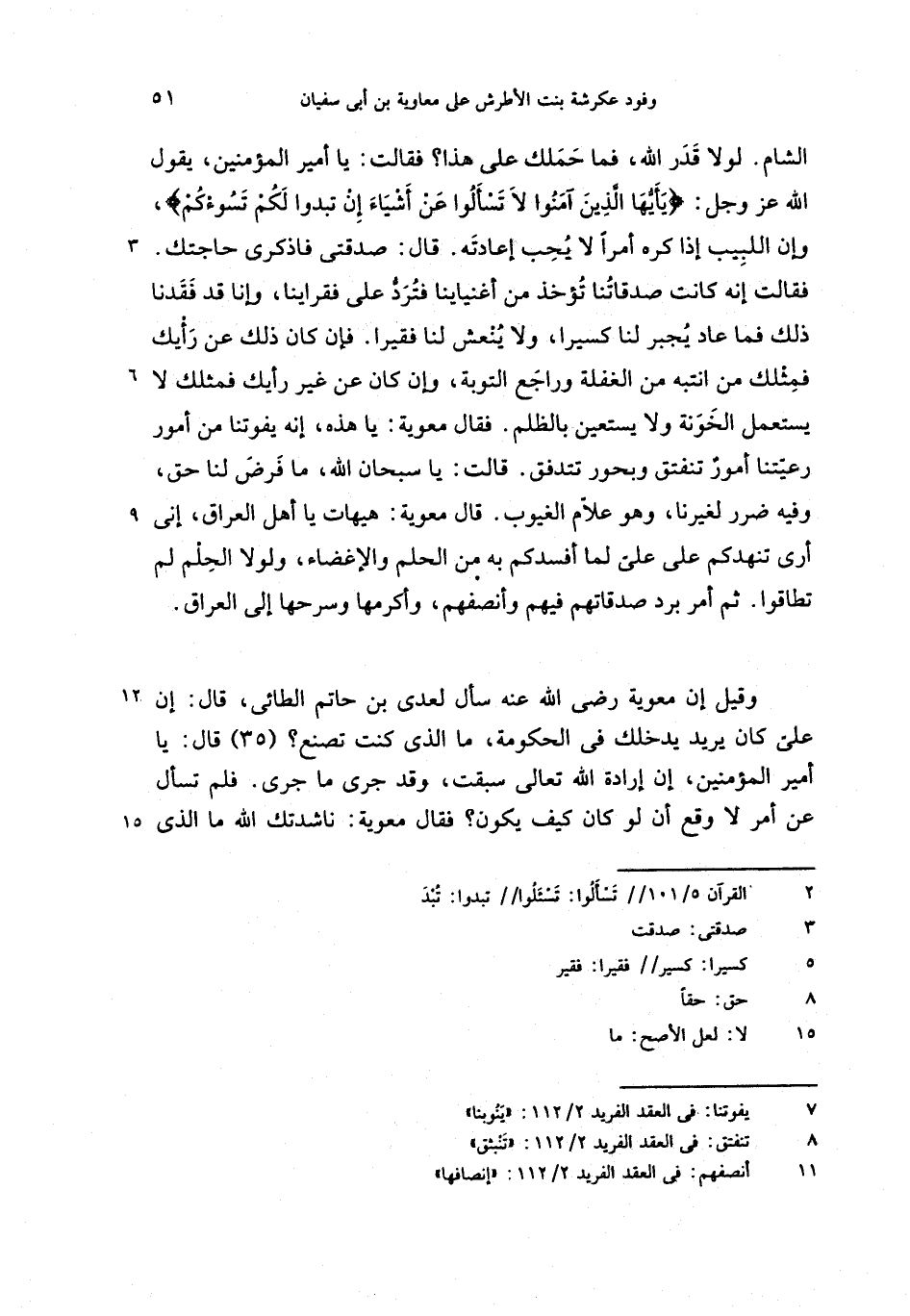 فقالت إنه كانت صدقاتنا تؤخذ من أغنياينا فتردّ على فقراينا، وإنا قد فقدنا ذلك فما عاد يجبر لنا كسيرا، ولا ينعش لنا فقيرا. فإن كان ذلك عن رأيك فمثلك من انتبه من الغفلة وراجع التوبة، وإن كان عن غير رأيك فمثلك لا يستعمل الخونة ولا يستعين بالظلم. فقال معوية: يا هذه، إنه يفوتنا من أمور رعيّتنا أمور تنفتق وبحور تتدفق. قالت: يا سبحان الله، ما فرض لنا حق، وفيه ضرر لغيرنا، وهو علاّم الغيوب. قال معوية: هيهات يا أهل العراق، إنى أرى تنهدكم على علىّ لما أفسدكم به من الحلم والإغضاء، ولولا الحلم لم تطاقوا. ثم أمر برد صدقاتهم فيهم وأنصفهم، وأكرمها وسرحها إلى العراق.