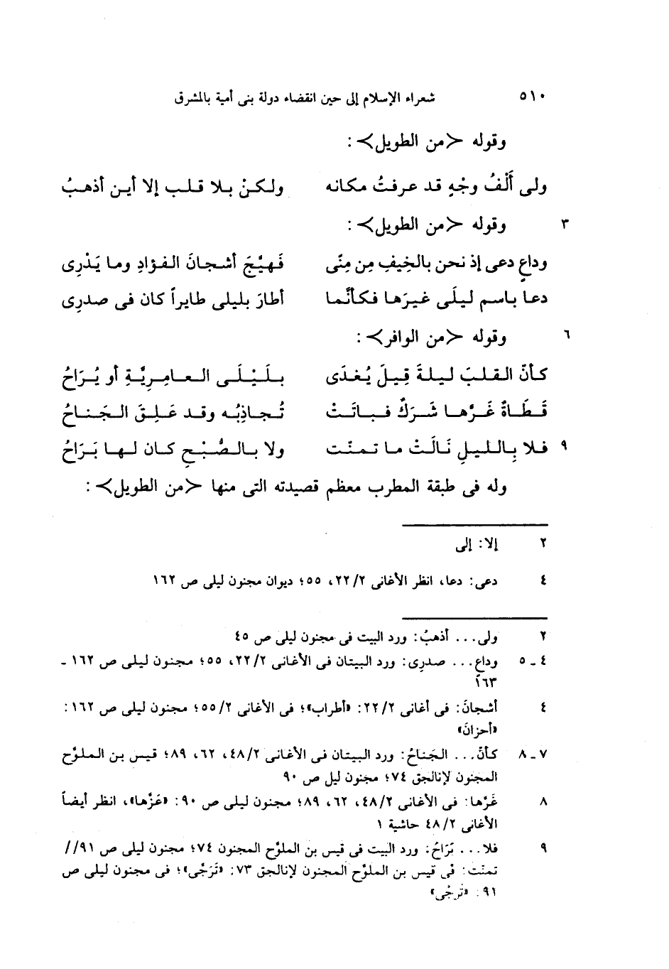 (9) فلا. . . براح: ورد البيت فى قيس بن الملوّح المجنون 74؛ مجنون ليلى ص /91/ تمنّت: فى قيس بن الملوّح المجنون لإنالجق 73: «ترجّى»؛ فى مجنون ليلى ص 91: «ترجّى»