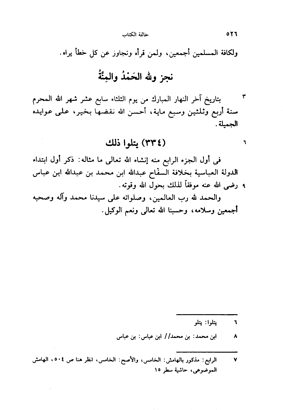 فى أول الجزء الرابع منه إنشاء الله تعالى ما مثاله: ذكر أول ابتداء الدولة العباسية بخلافة السفّاح عبد الله ابن محمد بن عبد الله ابن عباس رضى الله عنه موفقا لذلك بحول الله وقوته.