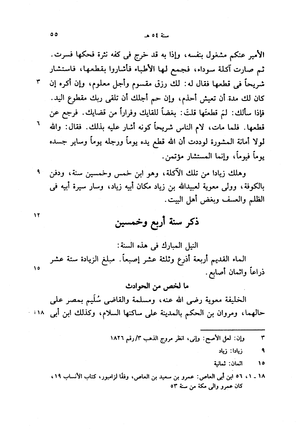 وهلك زيادا من تلك الآكلة، وهو ابن خمس وخمسين سنة، ودفن بالكوفة، وولى معوية لعبيد الله بن زياد مكان أبيه زياد، وسار سيرة أبيه فى الظلم والعسف وبغض أهل البيت.