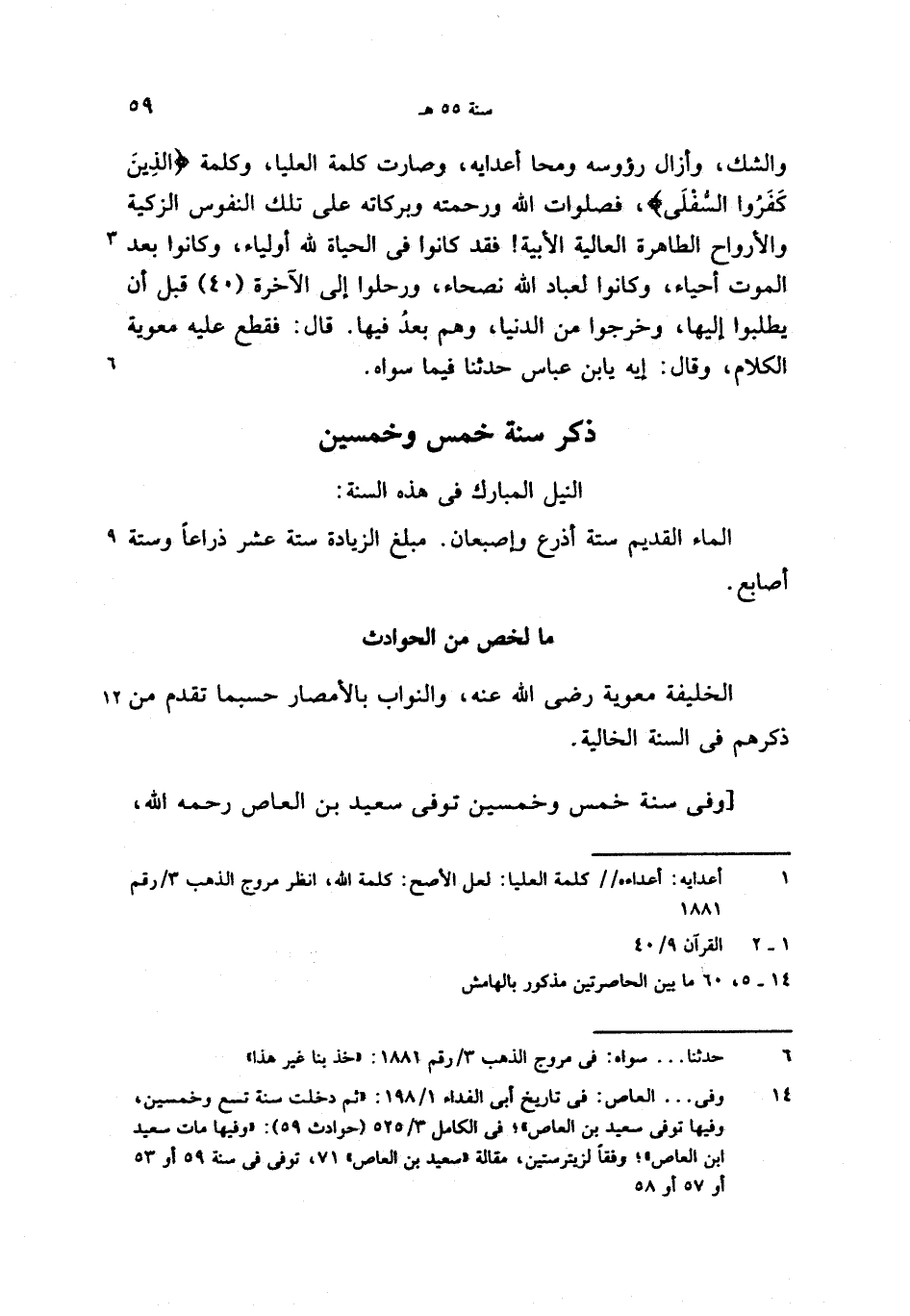 (14) وفى. . . العاص: فى تاريخ أبى الفداء 1/ 198: «ثم دخلت سنة تسع وخمسين، وفيها توفى سعيد بن العاص»؛ فى الكامل 3/ 525 (حوادث 59): «وفيها مات سعيد ابن العاص»؛ وفقا لزيترستين، مقالة «سعيد بن العاص» 71، توفى فى سنة 59 أو 53 أو 57 أو 58