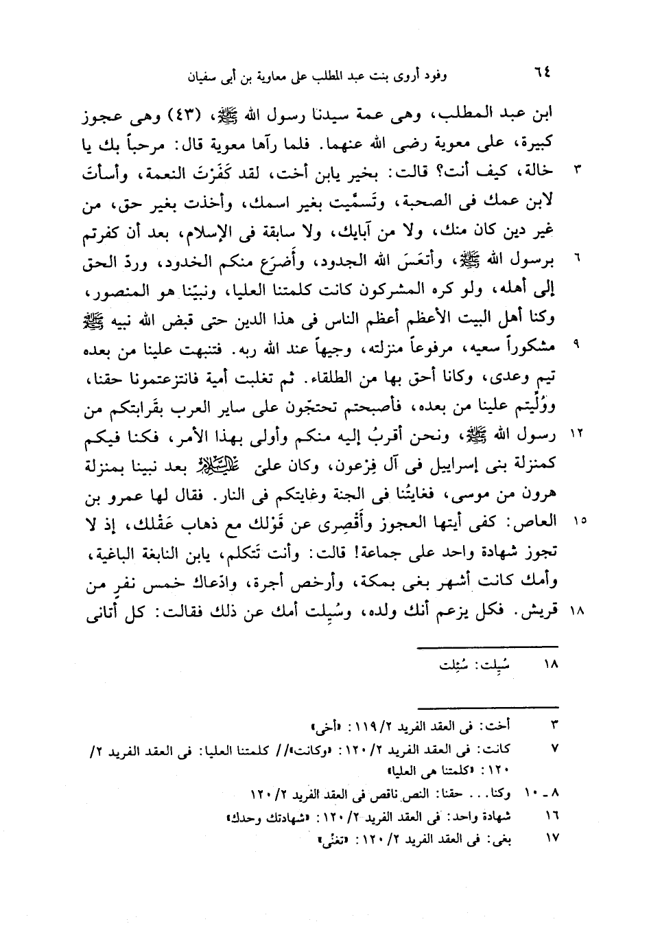 ابن عبد المطلب، وهى عمة سيدنا رسول الله صلّى الله عليه وسلّم، (43) وهى عجوز كبيرة، على معوية رضى الله عنهما. فلما رآها معوية قال: مرحبا بك يا خالة، كيف أنت؟ قالت: بخير يابن أخت، لقد كفرت النعمة، وأسأت لابن عمك فى الصحبة، وتسمّيت بغير اسمك، وأخذت بغير حق، من غير دين كان منك، ولا من آبايك، ولا سابقة فى الإسلام، بعد أن كفرتم برسول الله صلّى الله عليه وسلّم، وأتعس الله الجدود، وأضرع منكم الخدود، وردّ الحق إلى أهله، ولو كره المشركون كانت كلمتنا العليا، ونبيّنا هو المنصور، وكنا أهل البيت الأعظم أعظم الناس فى هذا الدين حتى قبض الله نبيه صلّى الله عليه وسلم مشكورا سعيه، مرفوعا منزلته، وجيها عند الله ربه. فتنبهت علينا من بعده تيم وعدى، وكانا أحق بها من الطلقاء. ثم تغلبت أمية فانتزعتمونا حقنا، وولّيتم علينا من بعده، فأصبحتم تحتجّون على ساير العرب بقرابتكم من رسول الله صلّى الله عليه وسلّم، ونحن أقرب إليه منكم وأولى بهذا الأمر، فكنا فيكم كمنزلة بنى إسراييل فى آل فرعون، وكان علىّ عليه السّلام بعد نبينا بمنزلة هرون من موسى، فغايتنا فى الجنة وغايتكم فى النار. فقال لها عمرو بن العاص: كفى أيتها العجوز وأقصرى عن قولك مع ذهاب عقلك، إذ لا تجوز شهادة واحد على جماعة! قالت: وأنت تتكلم، يابن النابغة الباغية، وأمك كانت أشهر بغى بمكة، وأرخص أجرة، وادّعاك خمس نفر من قريش. فكل يزعم أنك ولده، وسيلت أمك عن ذلك فقالت: كل أتانى