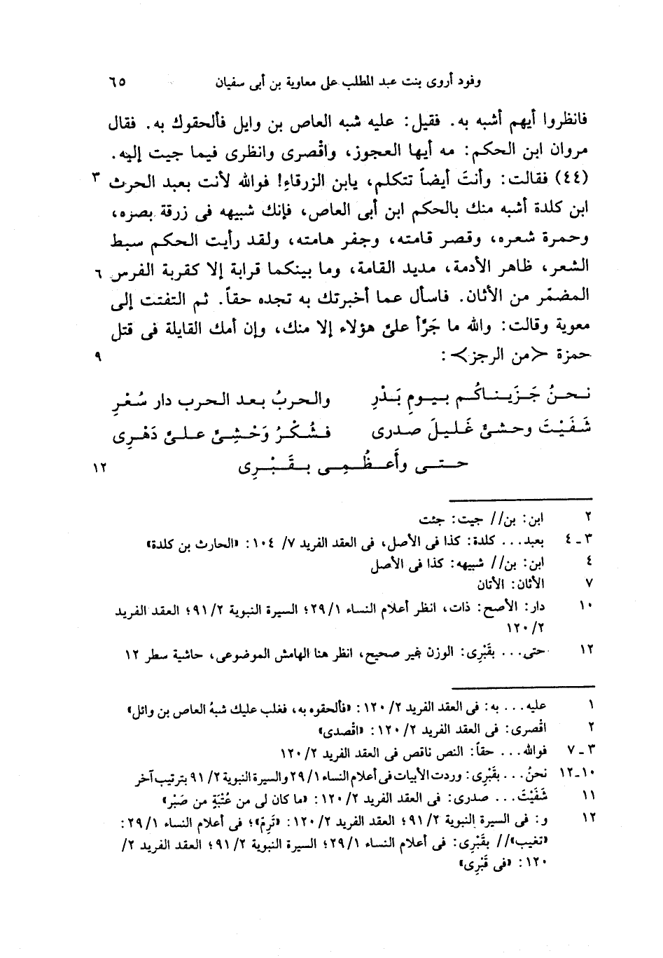 (44) فقالت: وأنت أيضا تتكلم، يابن الزرقاء! فو الله لأنت بعبد الحرث ابن كلدة أشبه منك بالحكم ابن أبى العاص، فإنك شبيهه فى زرقة بصره، وحمرة شعره، وقصر قامته، وجفر هامته، ولقد رأيت الحكم سبط الشعر، ظاهر الأدمة، مديد القامة، وما بينكما قرابة إلا كقربة الفرس المضمّر من الأثان. فاسأل عما أخبرتك به تجده حقا. ثم التفتت إلى معوية وقالت: والله ما جرّا علىّ هؤلاء إلا منك، وإن أمك القايلة فى قتل حمزة <من الرجز>: