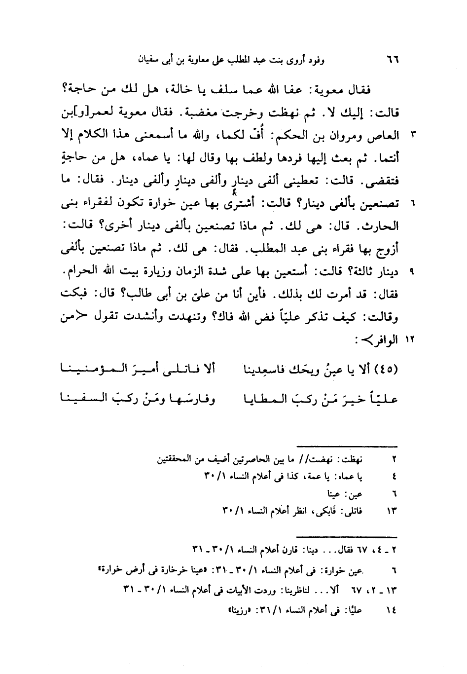 (13 - 2،67) ألا. . . لناظرينا: وردت الأبيات فى أعلام النساء 1/ 30 - 31
