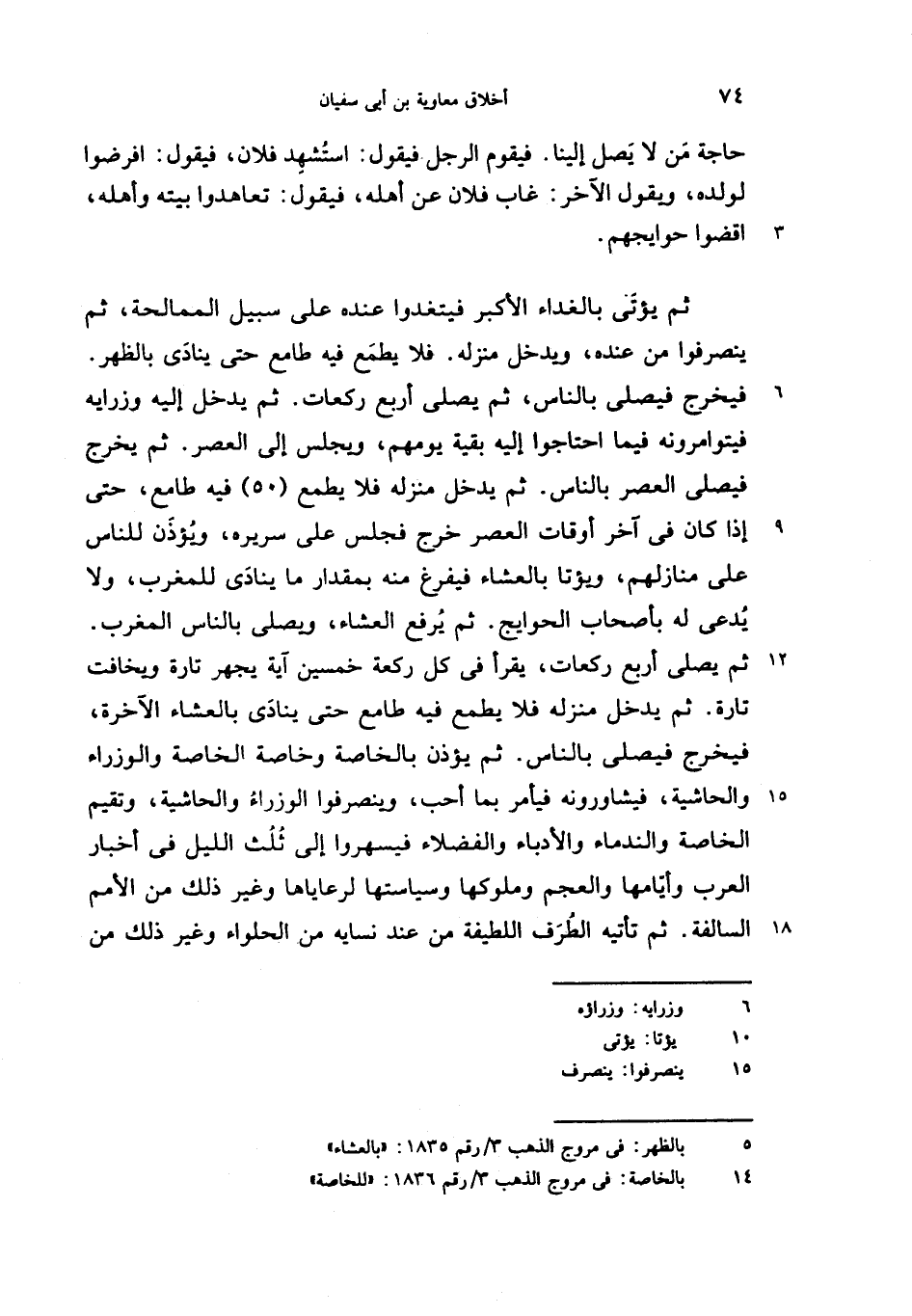 فيخرج فيصلى بالناس، ثم يصلى أربع ركعات. ثم يدخل إليه وزرايه فيتوامرونه فيما احتاجوا إليه بقية يومهم، ويجلس إلى العصر. ثم يخرج فيصلى العصر بالناس. ثم يدخل منزله فلا يطمع (50) فيه طامع، حتى إذا كان فى آخر أوقات العصر خرج فجلس على سريره، ويؤذن للناس على منازلهم، ويؤتا بالعشاء فيفرغ منه بمقدار ما ينادى للمغرب، ولا يدعى له بأصحاب الحوايج. ثم يرفع العشاء، ويصلى بالناس المغرب.