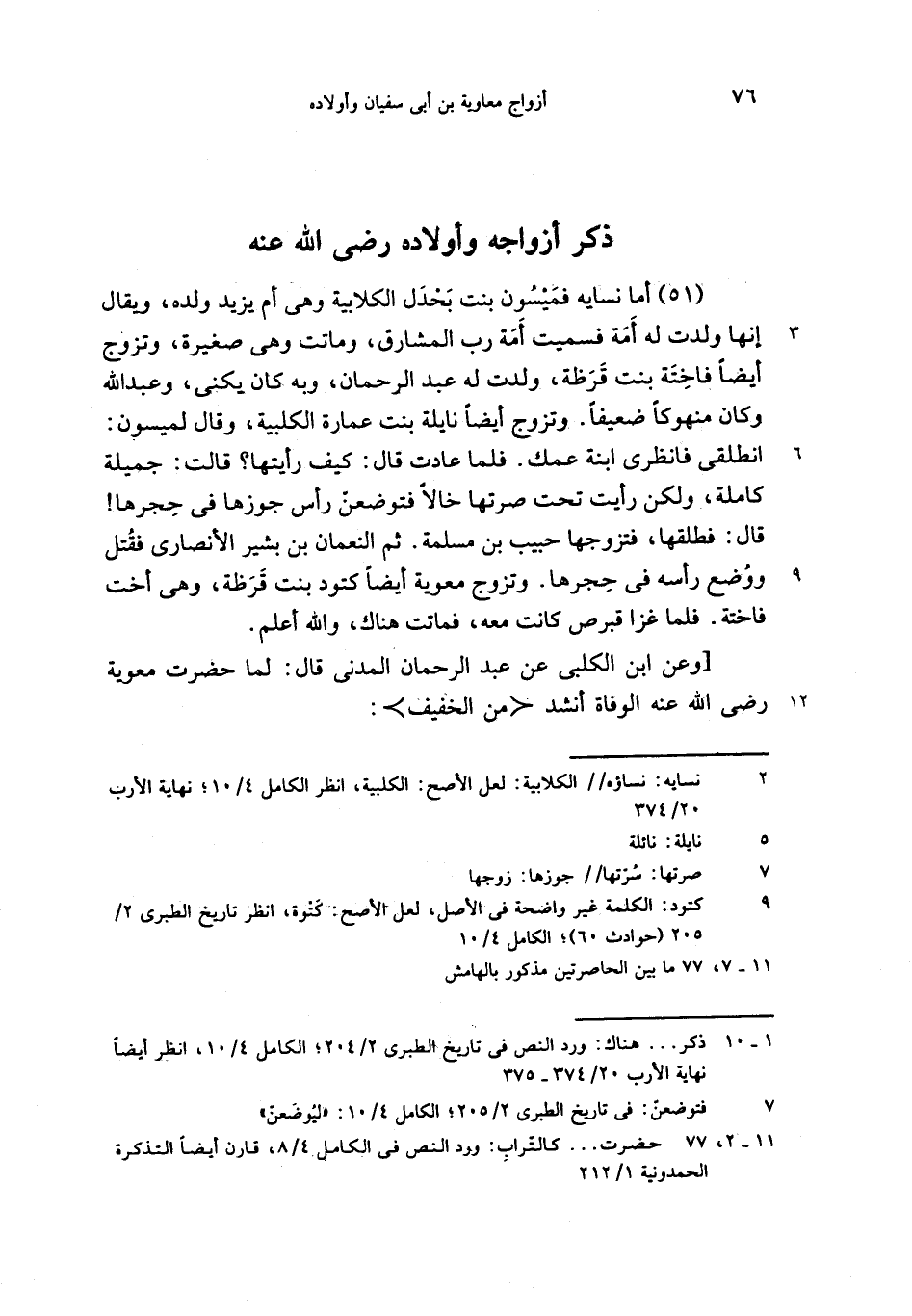 (51) أما نسايه فميسون بنت بحدل الكلابية وهى أم يزيد ولده، ويقال إنها ولدت له أمة فسميت أمة رب المشارق، وماتت وهى صغيرة، وتزوج أيضا فاختة بنت قرظة، ولدت له عبد الرحمان، وبه كان يكنى، وعبد الله وكان منهوكا ضعيفا. وتزوج أيضا نايلة بنت عمارة الكلبية، وقال لميسون: