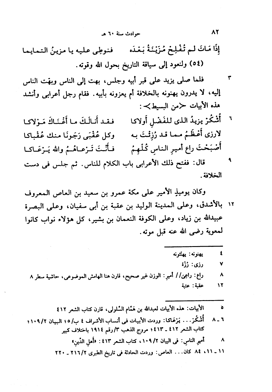 فلما صلى يزيد على قبر أبيه وجلس، بهت إلى الناس وبهّت الناس إليه، لا يدرون يهنونه بالخلافة أم يعزونه بأبيه. فقام رجل أعرابى وأنشد هذه الأبيات <من البسيط>: