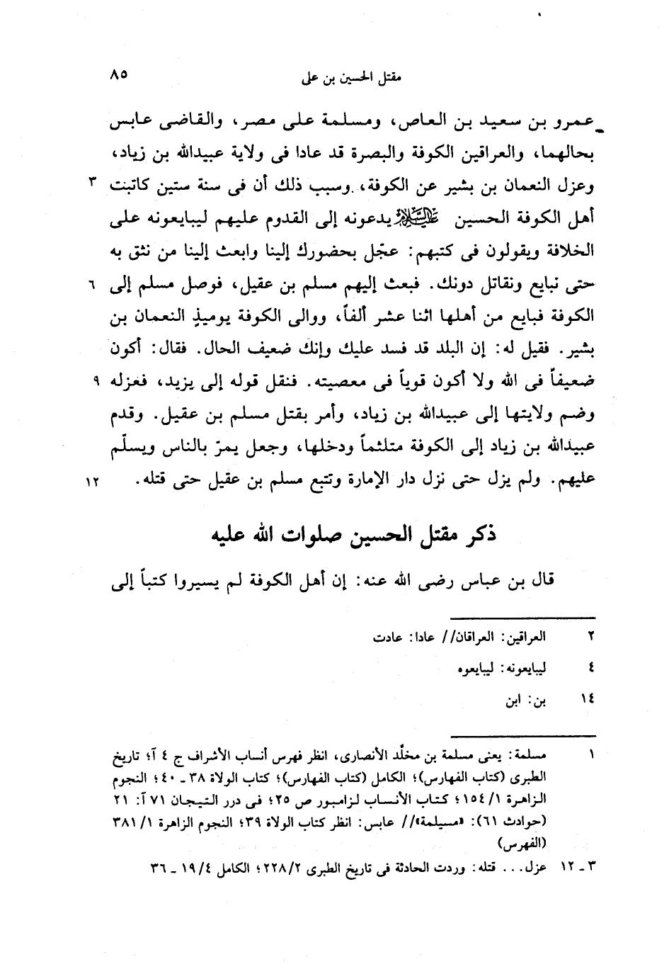 عمرو بن سعيد بن العاص، ومسلمة على مصر، والقاضى عابس بحالهما، والعراقين الكوفة والبصرة قد عادا فى ولاية عبيد الله بن زياد، وعزل النعمان بن بشير عن الكوفة، وسبب ذلك أن فى سنة ستين كاتبت أهل الكوفة الحسين عليه السّلام يدعونه إلى القدوم عليهم ليبايعونه على الخلافة ويقولون فى كتبهم: عجّل بحضورك إلينا وابعث إلينا من نثق به حتى نبايع ونقاتل دونك. فبعث إليهم مسلم بن عقيل، فوصل مسلم إلى الكوفة فبايع من أهلها اثنا عشر ألفا، ووالى الكوفة يوميذ النعمان بن بشير. فقيل له: إن البلد قد فسد عليك وإنك ضعيف الحال. فقال: أكون ضعيفا فى الله ولا أكون قويا فى معصيته. فنقل قوله إلى يزيد، فعزله وضم ولايتها إلى عبيد الله بن زياد، وأمر بقتل مسلم بن عقيل. وقدم عبيد الله بن زياد إلى الكوفة متلثما ودخلها، وجعل يمرّ بالناس ويسلّم عليهم. ولم يزل حتى نزل دار الإمارة وتتبع مسلم بن عقيل حتى قتله.