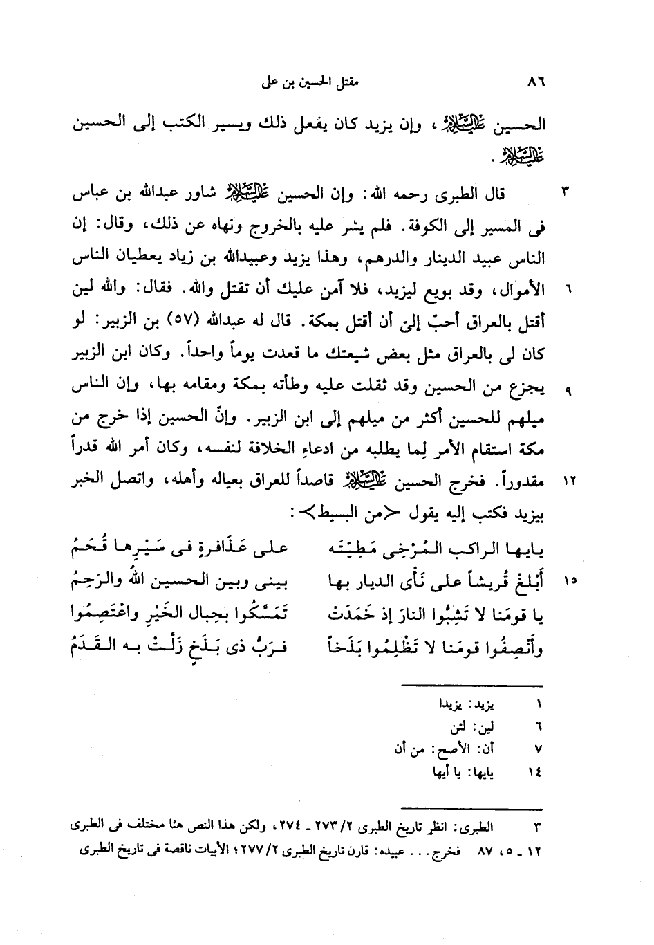 قال الطبرى رحمه الله: وإن الحسين عليه السّلام شاور عبد الله بن عباس فى المسير إلى الكوفة. فلم يشر عليه بالخروج ونهاه عن ذلك، وقال: إن الناس عبيد الدينار والدرهم، وهذا يزيد وعبيد الله بن زياد يعطيان الناس الأموال، وقد بويع ليزيد، فلا آمن عليك أن تقتل والله. فقال: والله لين أقتل بالعراق أحبّ إلىّ أن أقتل بمكة. قال له عبد الله (57) بن الزبير: لو كان لى بالعراق مثل بعض شيعتك ما قعدت يوما واحدا. وكان ابن الزبير يجزع من الحسين وقد ثقلت عليه وطأته بمكة ومقامه بها، وإن الناس ميلهم للحسين أكثر من ميلهم إلى ابن الزبير. وإنّ الحسين إذا خرج من مكة استقام الأمر لما يطلبه من ادعاء الخلافة لنفسه، وكان أمر الله قدرا مقدورا. فخرج الحسين عليه السّلام قاصدا للعراق بعياله وأهله، واتصل الخبر بيزيد فكتب إليه يقول <من البسيط>: