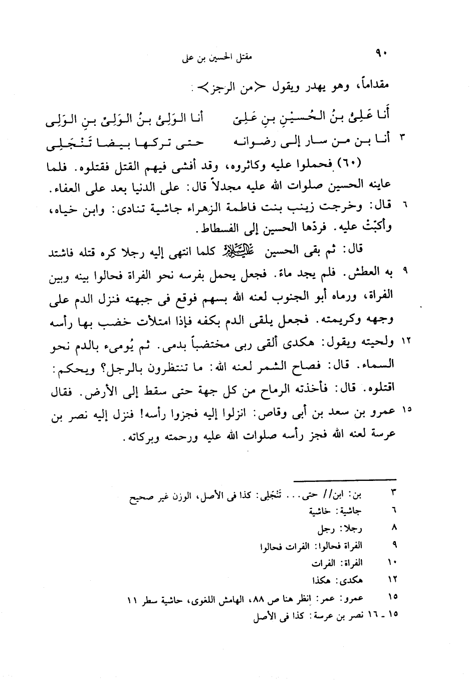 اقتلوه. قال: فأخذته الرماح من كل جهة حتى سقط إلى الأرض. فقال عمرو بن سعد بن أبى وقاص: انزلوا إليه فجزوا رأسه! فنزل إليه نصر بن عرسة لعنه الله فجز رأسه صلوات الله عليه ورحمته وبركاته.