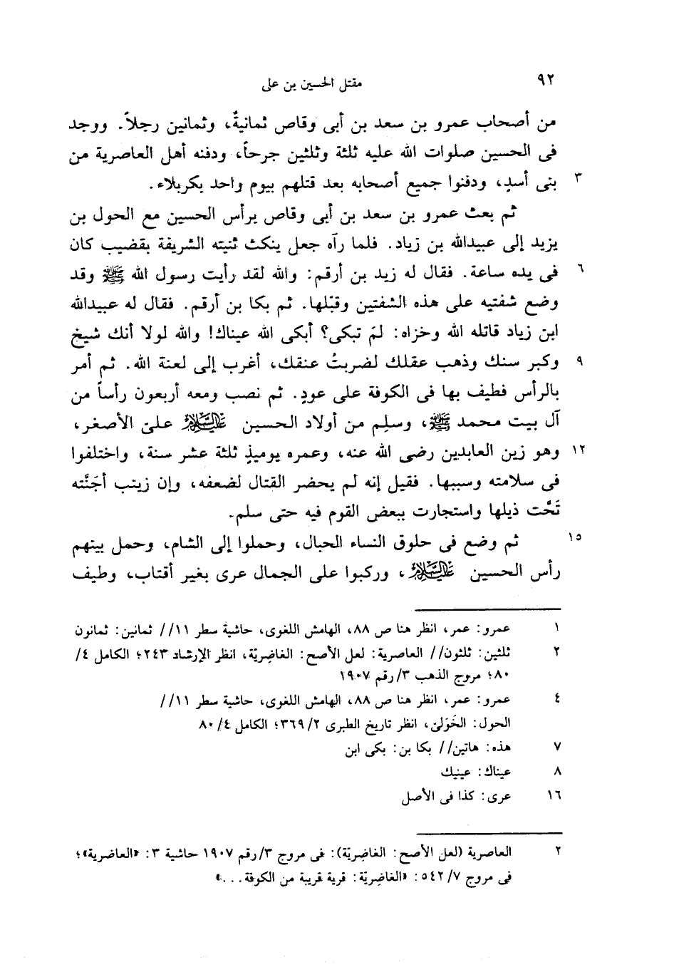 من أصحاب عمرو بن سعد بن أبى وقاص ثمانية، وثمانين رجلا. ووجد فى الحسين صلوات الله عليه ثلثة وثلثين جرحا، ودفنه أهل العاصرية من بنى أسد، ودفنوا جميع أصحابه بعد قتلهم بيوم واحد بكربلاء.