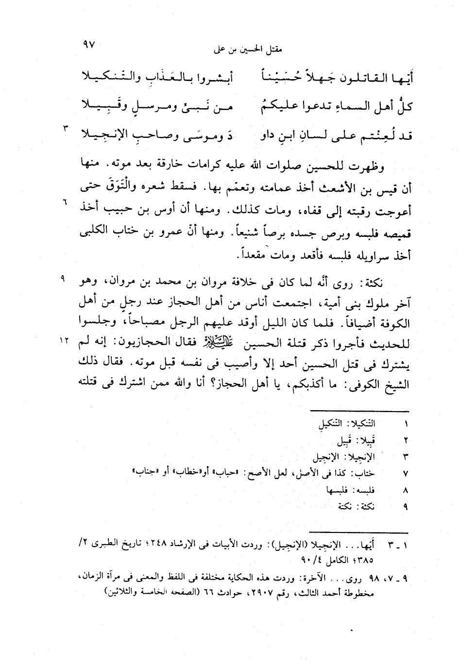 نكثة: روى أنّه لما كان فى خلافة مروان بن محمد بن مروان، وهو آخر ملوك بنى أمية، اجتمعت أناس من أهل الحجاز عند رجل من أهل الكوفة أضيافا. فلما كان الليل أوقد عليهم الرجل مصباحا، وجلسوا للحديث فأجروا ذكر قتلة الحسين عليه السّلام فقال الحجازيون: إنه لم يشترك فى قتل الحسين أحد إلا وأصيب فى نفسه قبل موته. فقال ذلك الشيخ الكوفى: ما أكذبكم، يا أهل الحجاز؟ أنا والله ممن اشترك فى قتلته