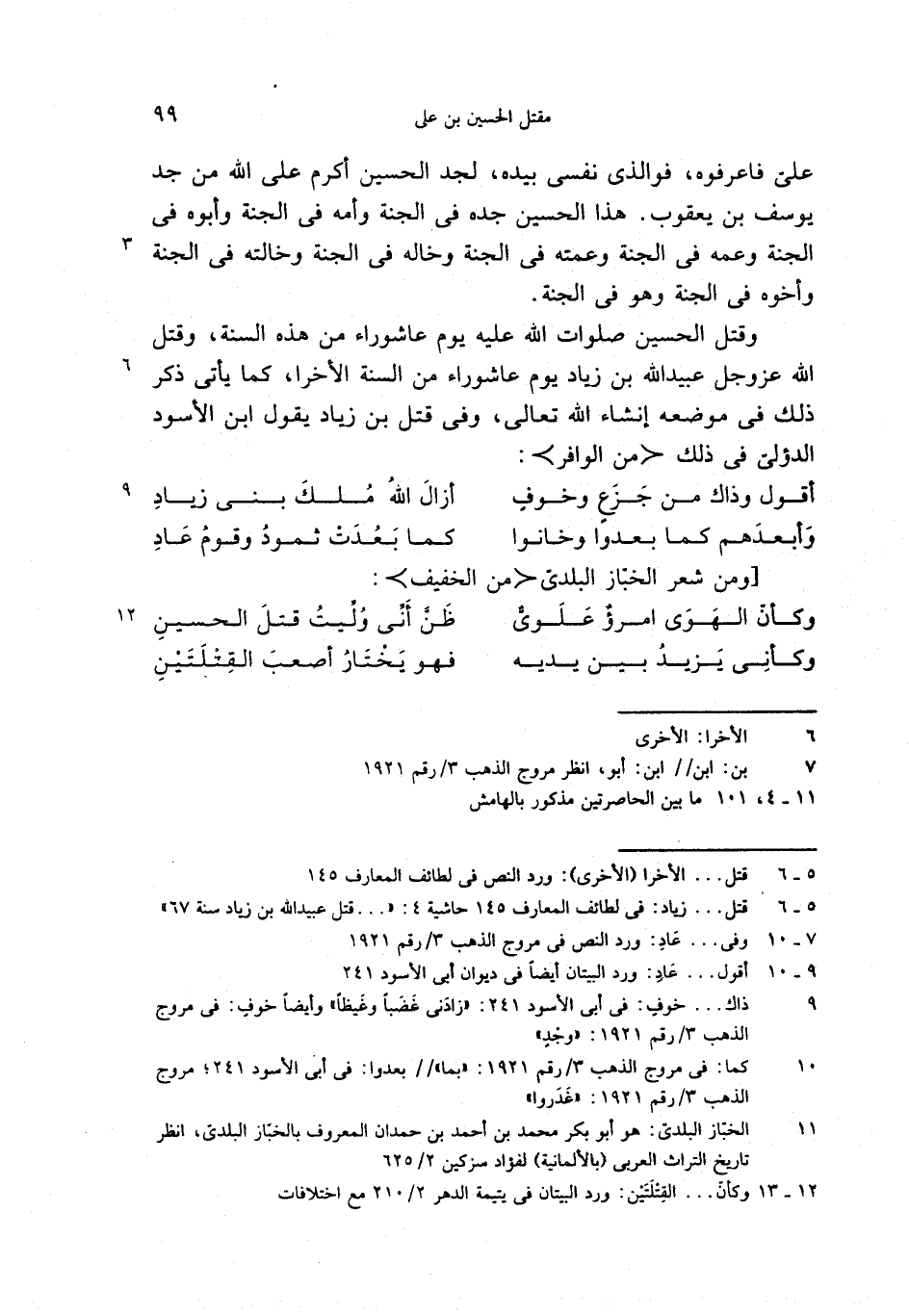 وقتل الحسين صلوات الله عليه يوم عاشوراء من هذه السنة، وقتل الله عز وجل عبيد الله بن زياد يوم عاشوراء من السنة الأخرا، كما يأتى ذكر ذلك فى موضعه إنشاء الله تعالى، وفى قتل بن زياد يقول ابن الأسود الدؤلىّ فى ذلك <من الوافر>: